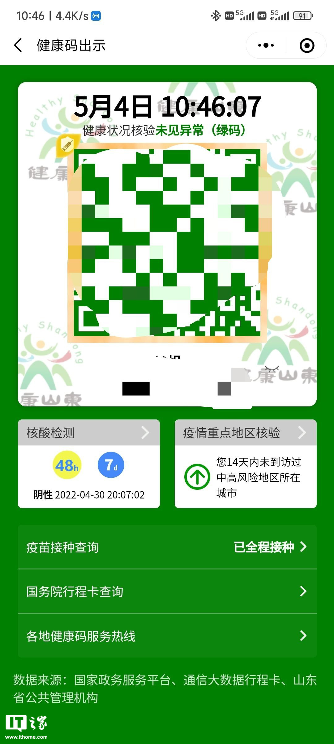 IT之家 5 月 4 日消息,5 月 4 日一早,不少市民发现山东健康码界面又“升级”了,可同屏显示健康码、核酸检测结果、疫情重点地区核验信息及疫苗接种情况等,比以前更加方便!