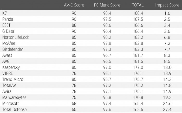 这一栏基本上代表了所获得的总分与190分的满分有多大差距。因此,影响分数越大,反恶意软件程序对测试系统的性能影响就越大。例如,如果我们以Microsoft Defender为例,它的影响得分是24.6,这意味着它的得分比190分的满分少24.6分,即165.4分。