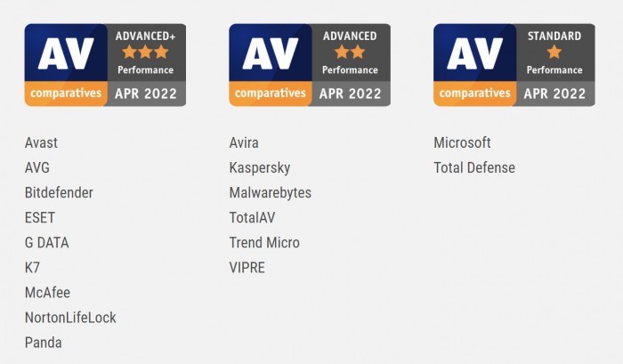 在AV-C的评级中,Defender勉强能够获得"标准"评级,因为它在评估中与Total Defense Anti-Virus一起排在倒数第二。本次测试主要面向以下反恶意软件产品进行: