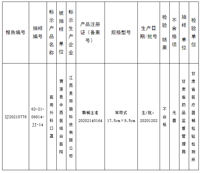 中国质量新闻网讯 近日,甘肃省药品监督管理局发布的医疗器械质量公告(2022年 第18号)显示,标示江西麦帝施科技有限公司生产的1个批次医用外科口罩被检出不合格。