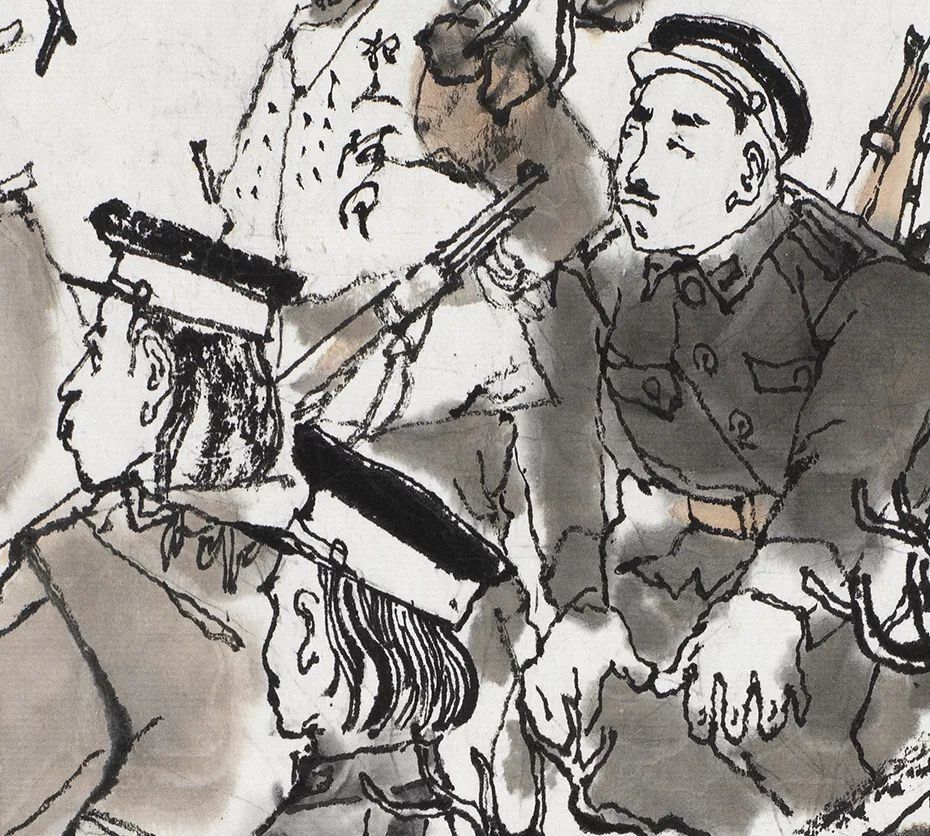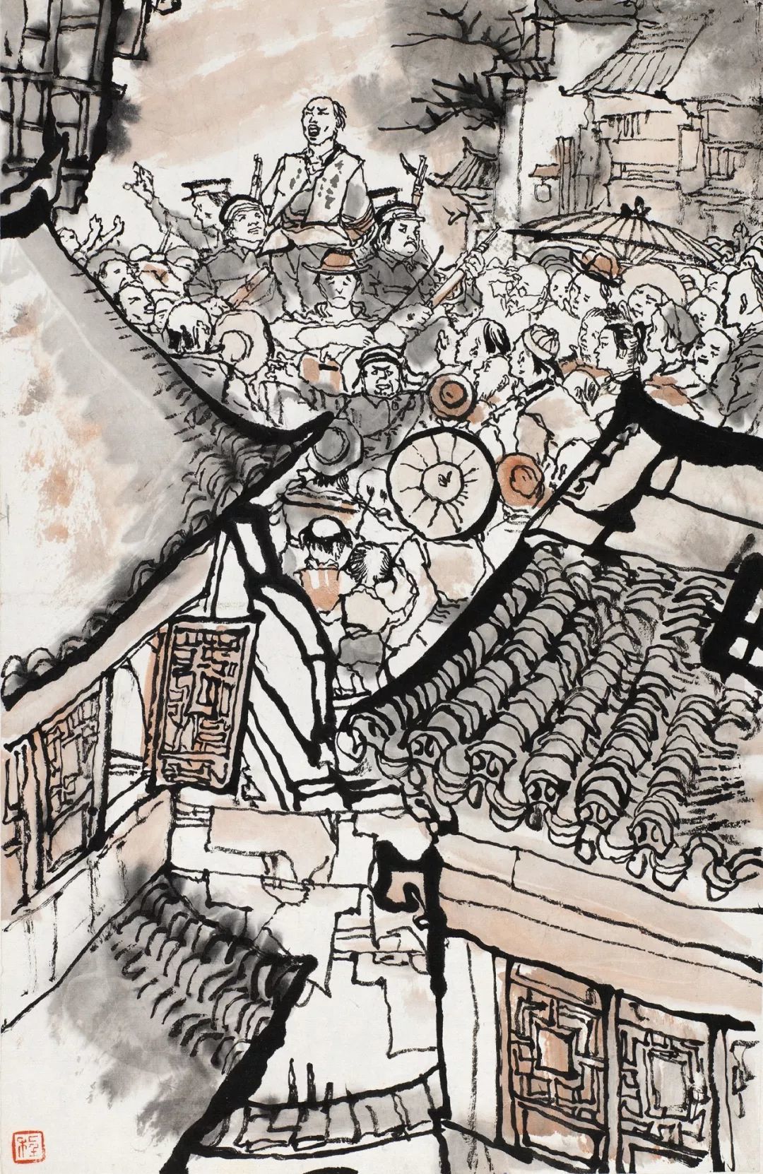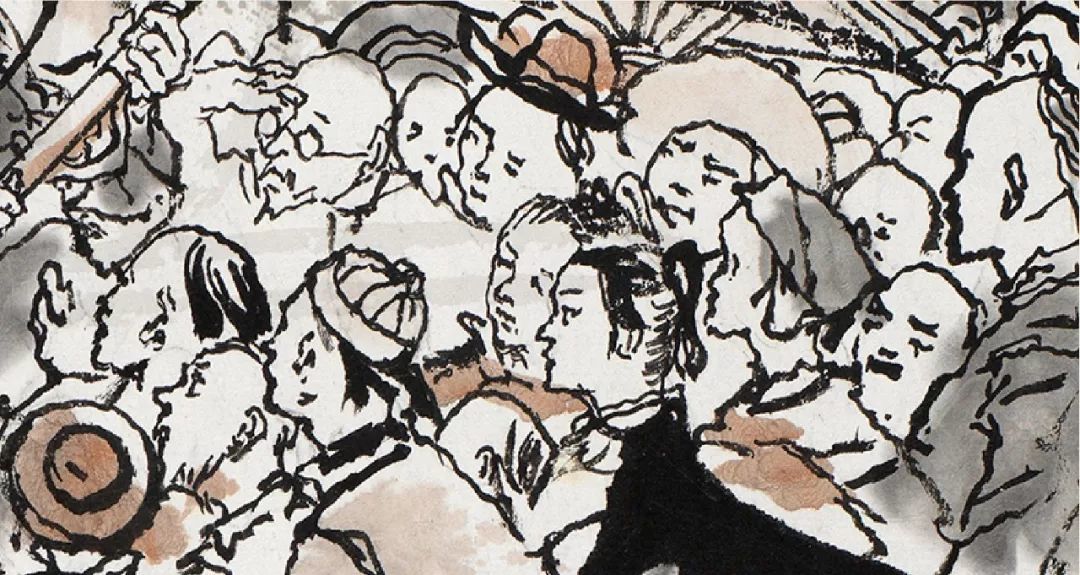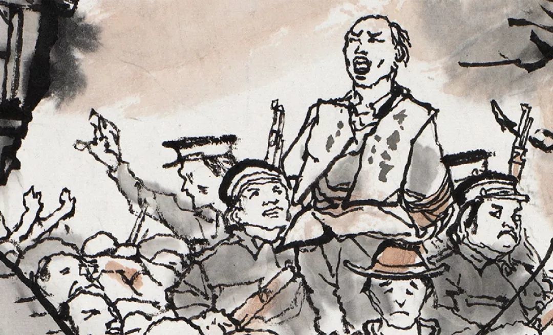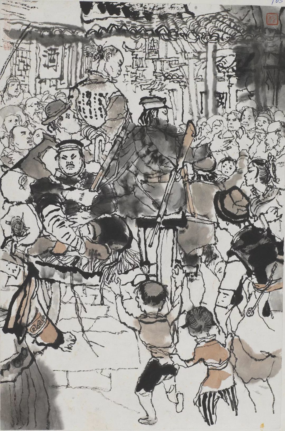 人群中,居于画面最高点的阿Q反应过来自己即将殒命,便在最后一刻喊出了壮烈的口号。在未庄的街市一角,各色人等接踵而至,将刑车围得水泄不通,画面中仍然充斥着人群的冷漠和官吏的跋扈。程十发以密不透风的刻画方式,以大块面的建筑物飞檐以及望不到尽头的街市与旁观人群,以一种观看与被观看的反讽式的手法,再一次地刻画了这种压抑、悲壮的场景,暗喻了看客们精神世界里的空洞与麻木,从而将《阿Q正传》结尾的高潮呈现在了观众面前。