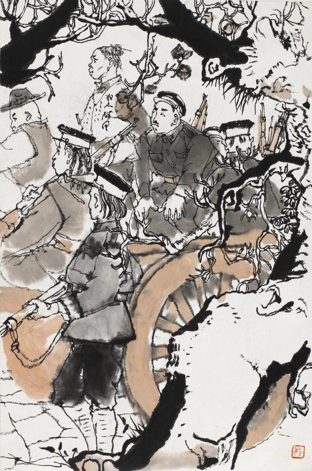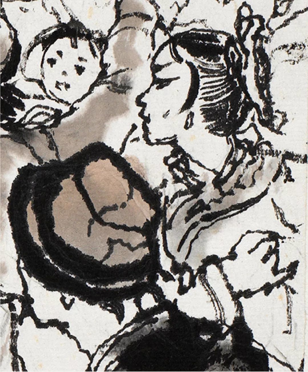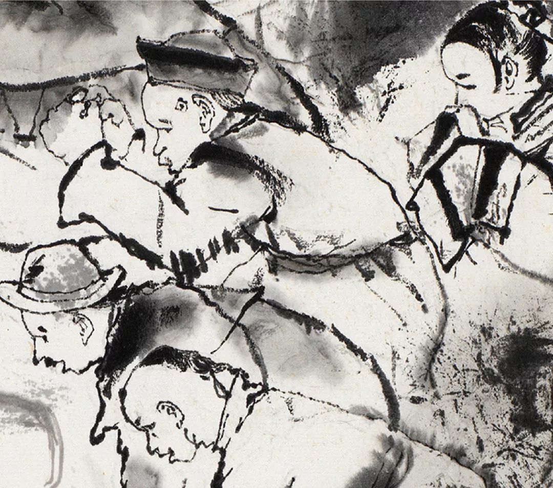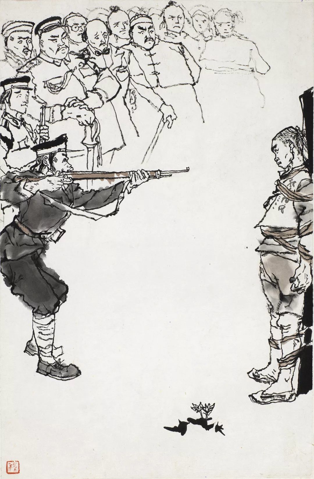 人群中,居于画面最高点的阿Q反应过来自己即将殒命,便在最后一刻喊出了壮烈的口号。在未庄的街市一角,各色人等接踵而至,将刑车围得水泄不通,画面中仍然充斥着人群的冷漠和官吏的跋扈。程十发以密不透风的刻画方式,以大块面的建筑物飞檐以及望不到尽头的街市与旁观人群,以一种观看与被观看的反讽式的手法,再一次地刻画了这种压抑、悲壮的场景,暗喻了看客们精神世界里的空洞与麻木,从而将《阿Q正传》结尾的高潮呈现在了观众面前。