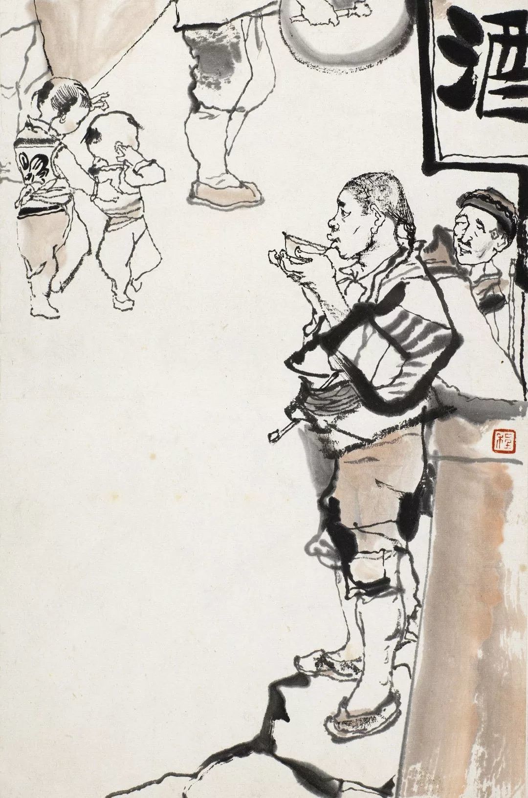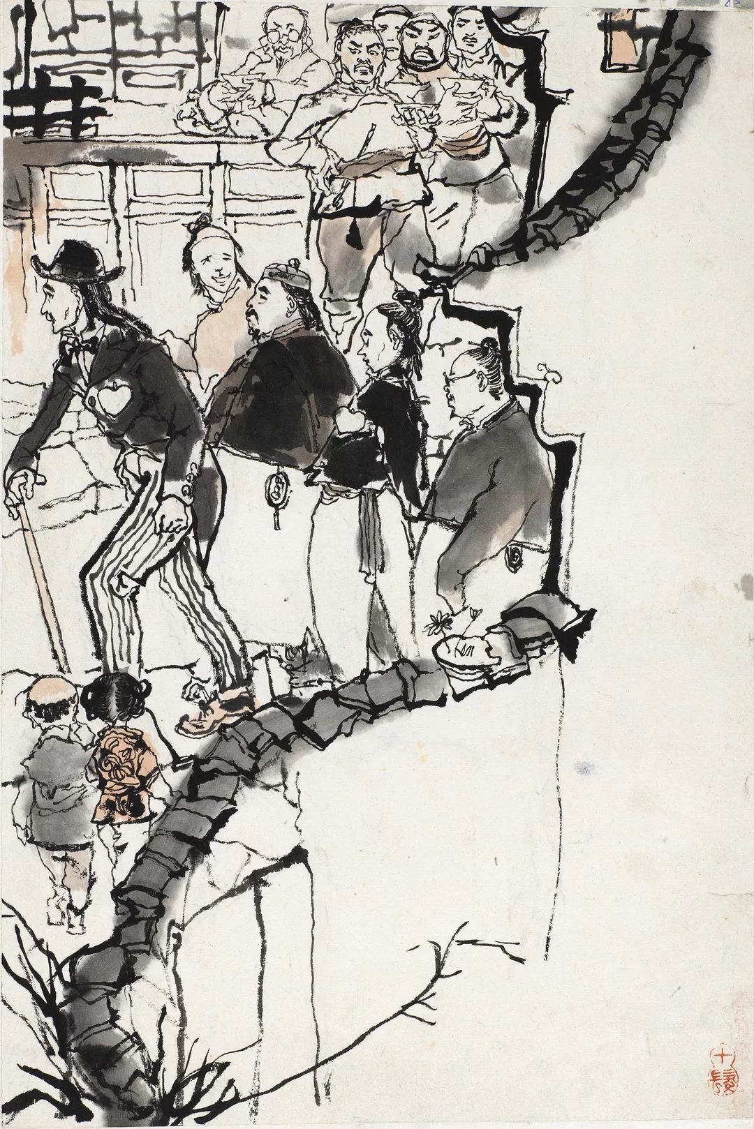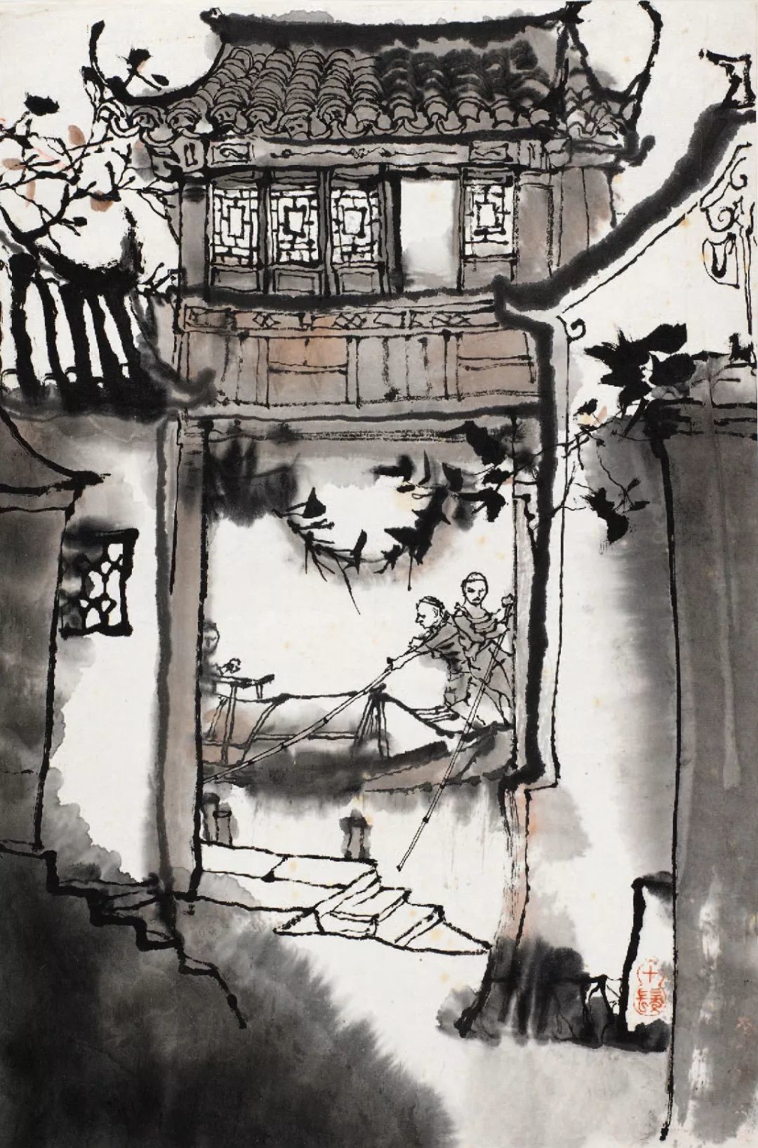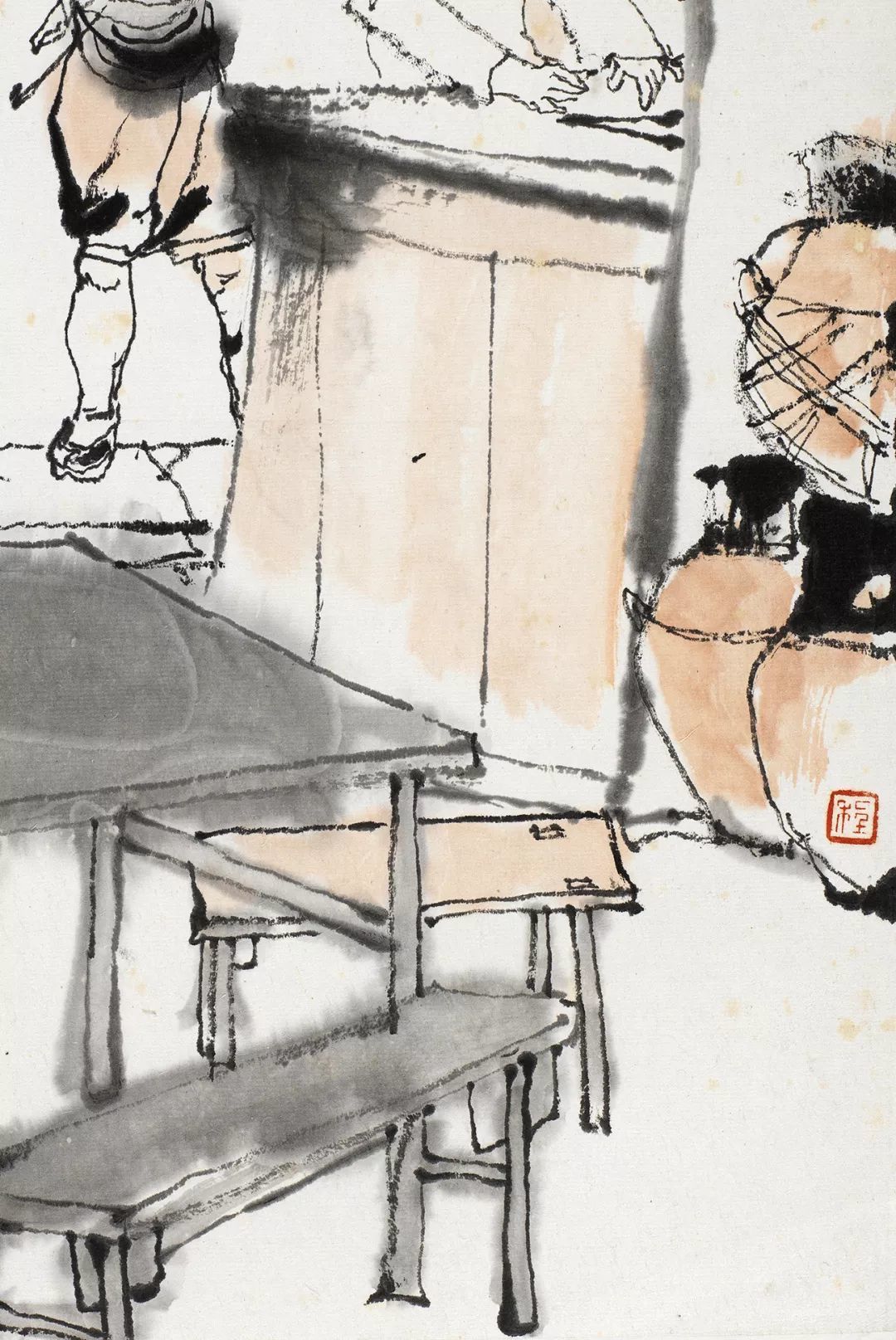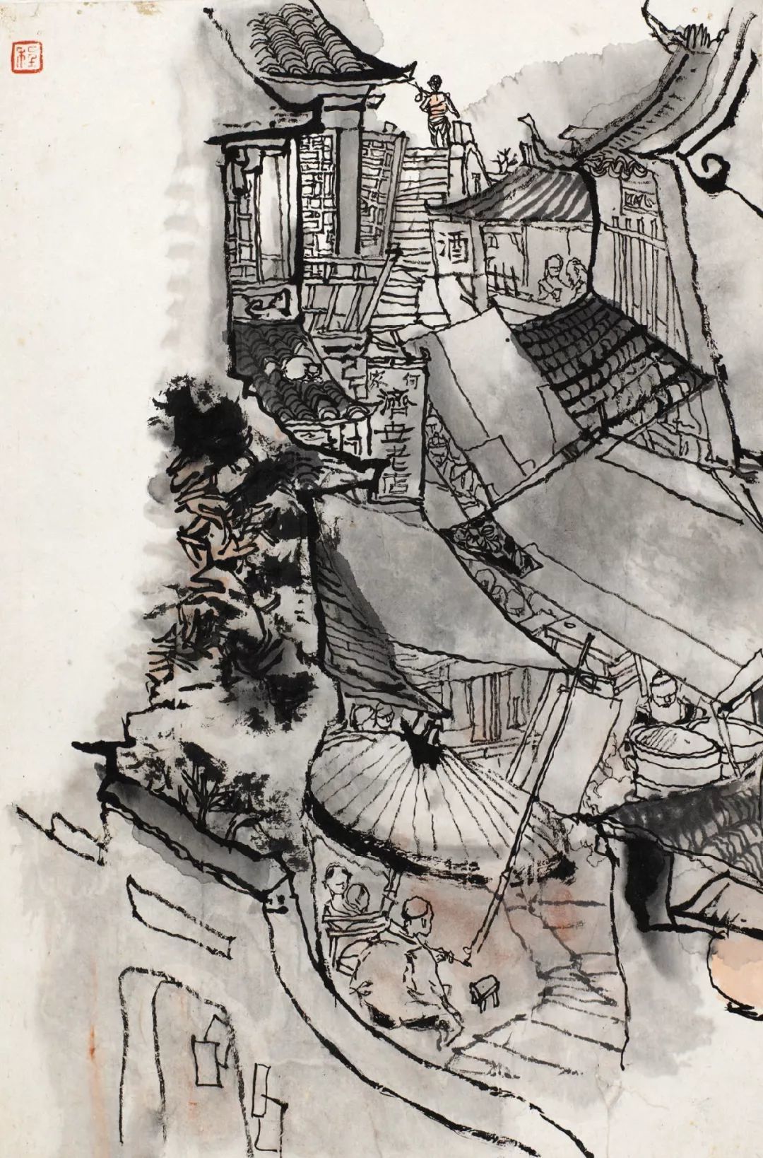 在这幅作品中,程十发着力刻画了未庄的街市建筑。这类建筑多为依托自家宅院改建而成的临街小铺,对街结构,有一种错落布排的自然生长状态。程十发用浓淡相间的墨笔线条,勾画石板街边的房屋与随意搭建的各色雨篷,并采用块面穿插的方式,形成弯曲的S形格局,以表现街市的局促和拥挤,从而将画面的叙事焦点引向上方桥头被迫远离的主人公。
