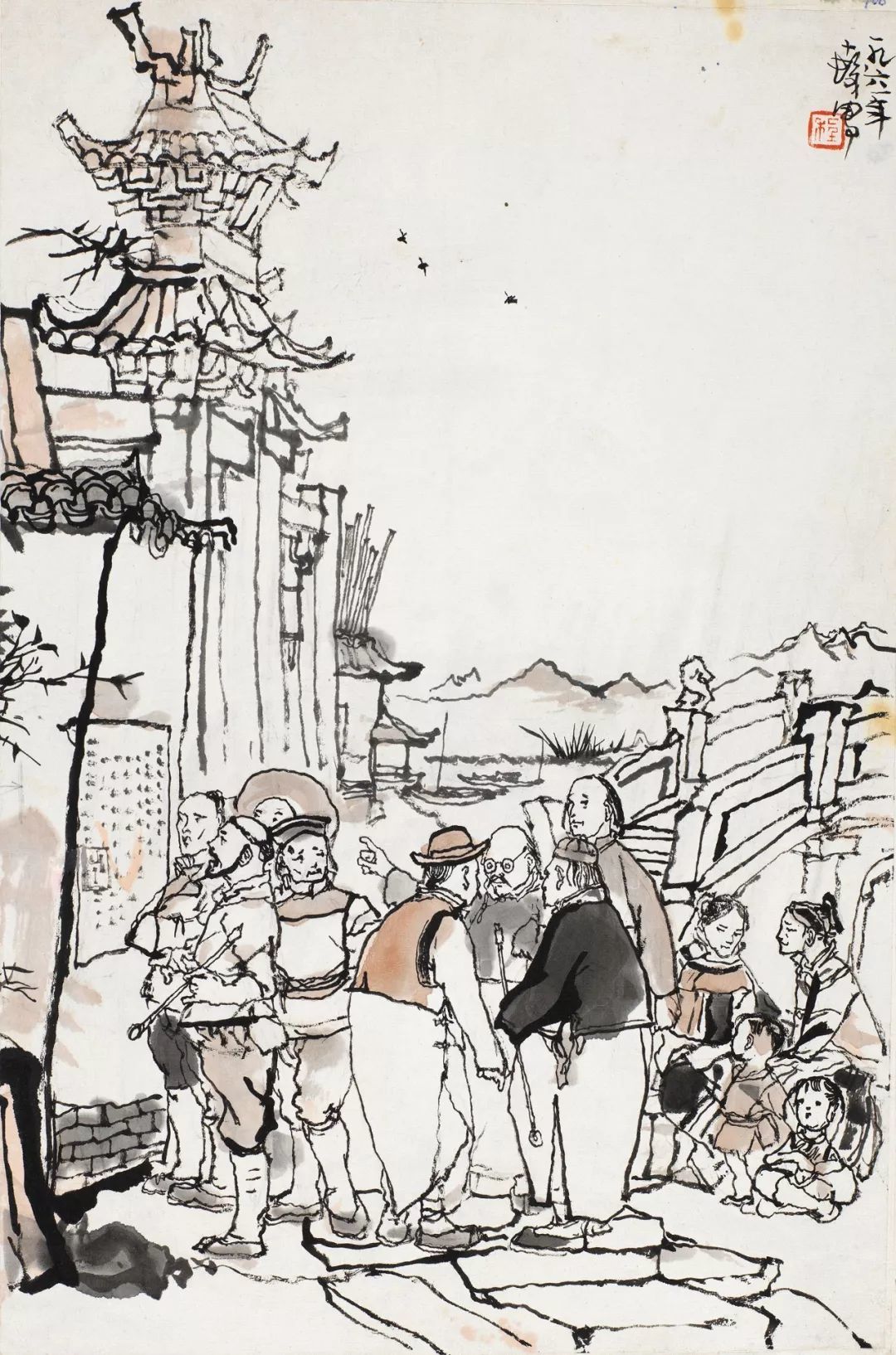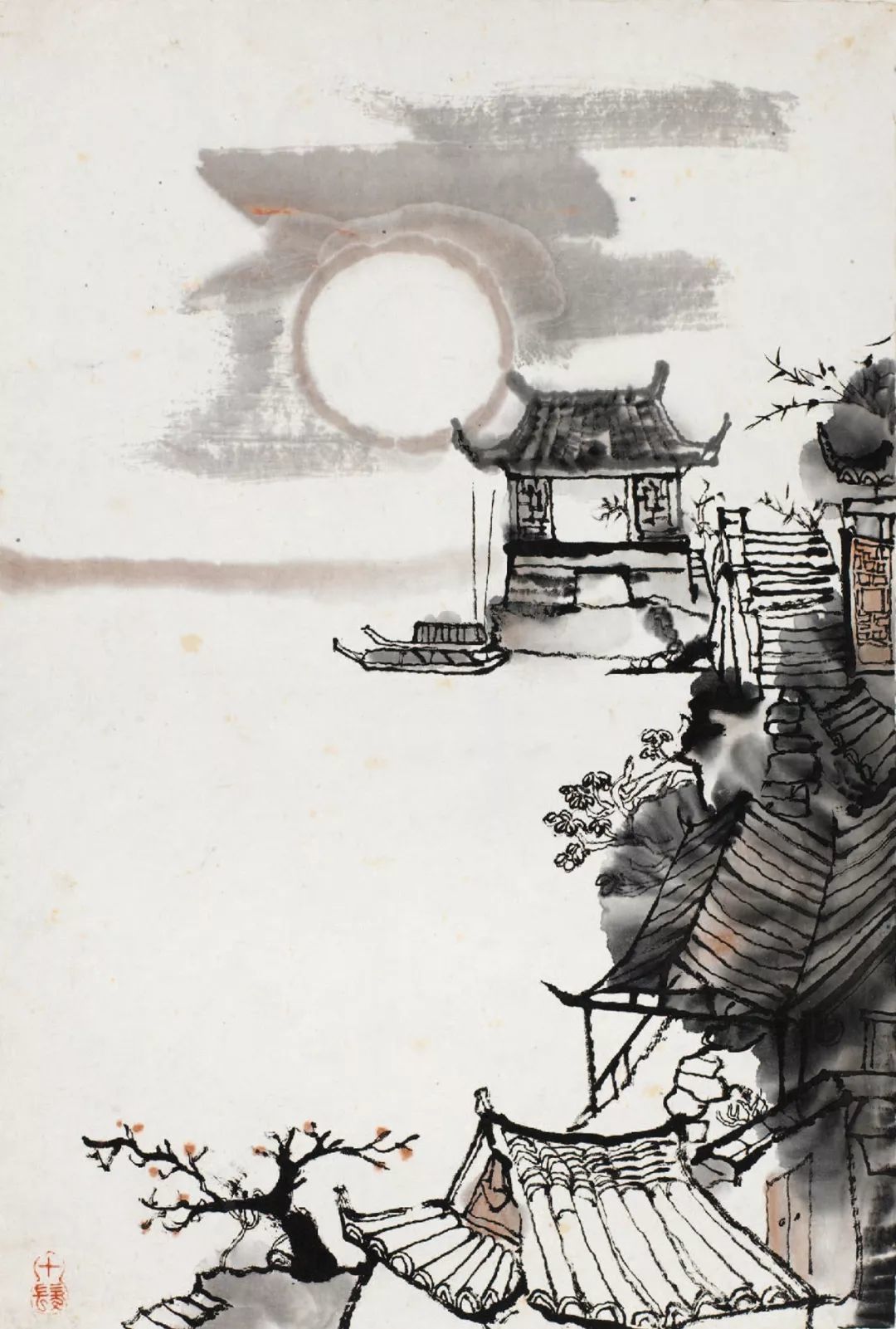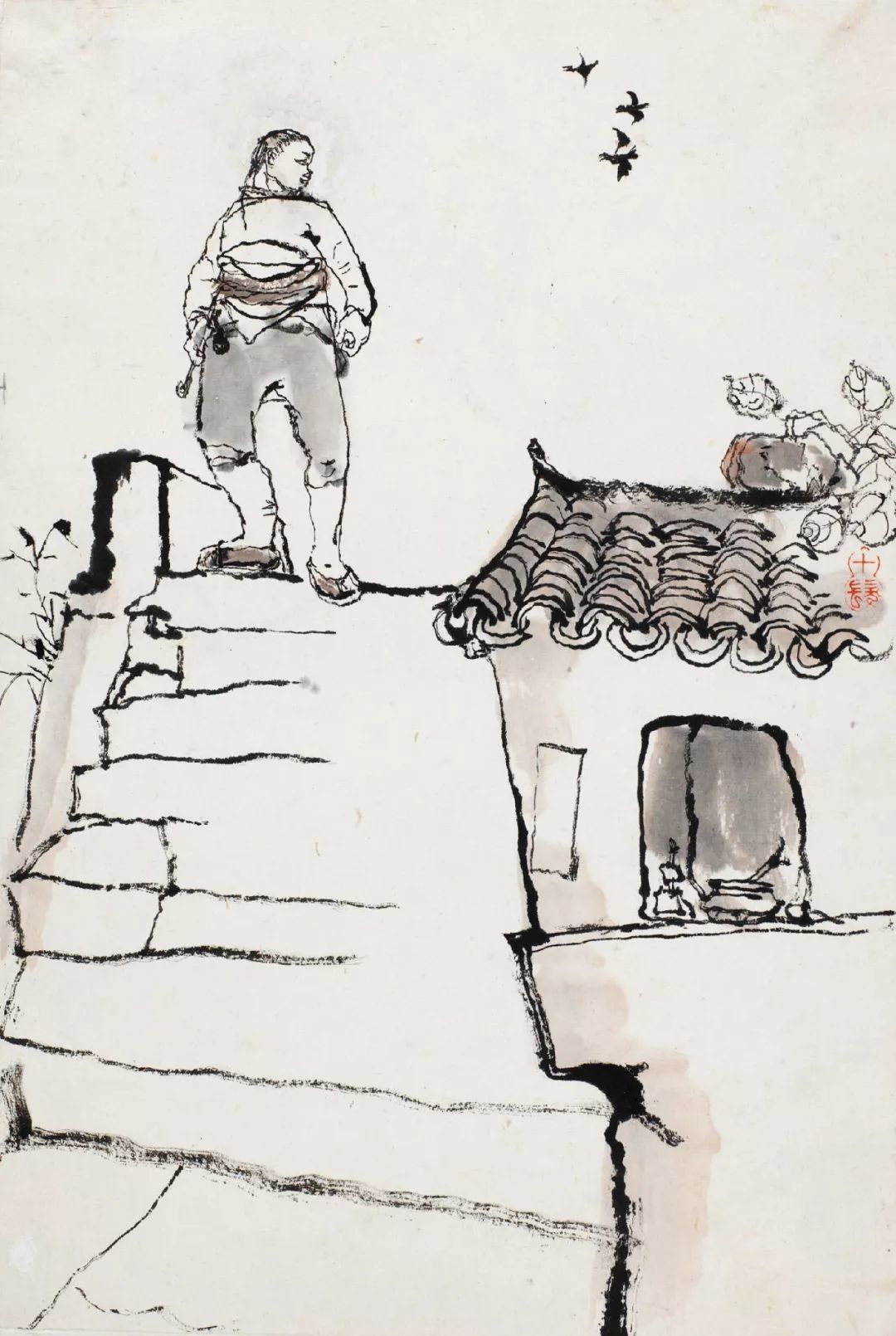 程十发又在此基础上,为建筑染上一层淡墨,进一步丰富了远离氛围的表达。为了在满幅构图中增加虚实相生的变化,程十发特别在画幅左上方采用了留白虚化的方法,与天空及下方墙面的留白连接以平衡画面。