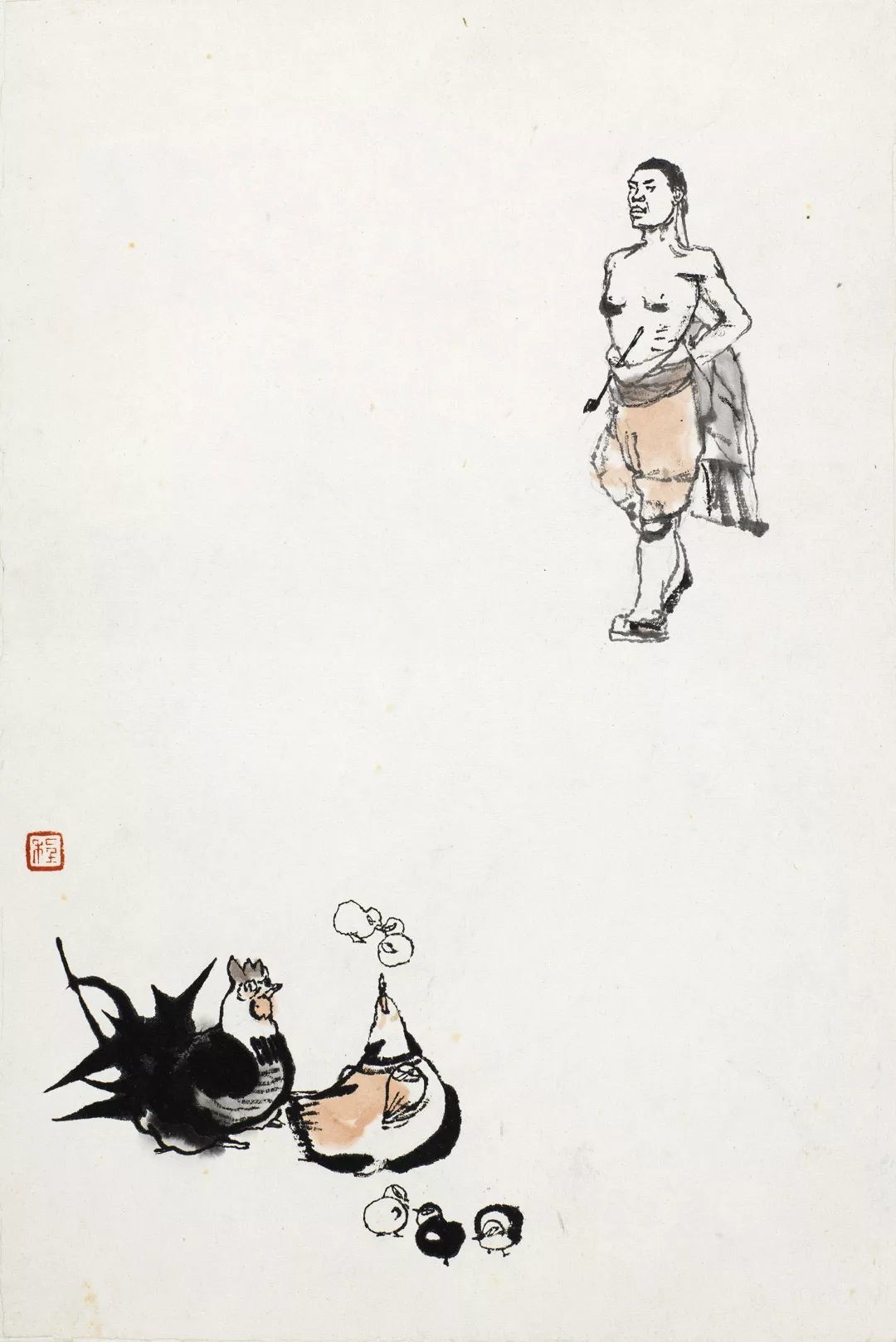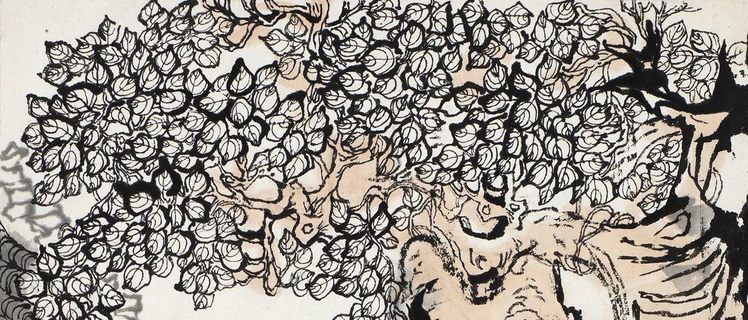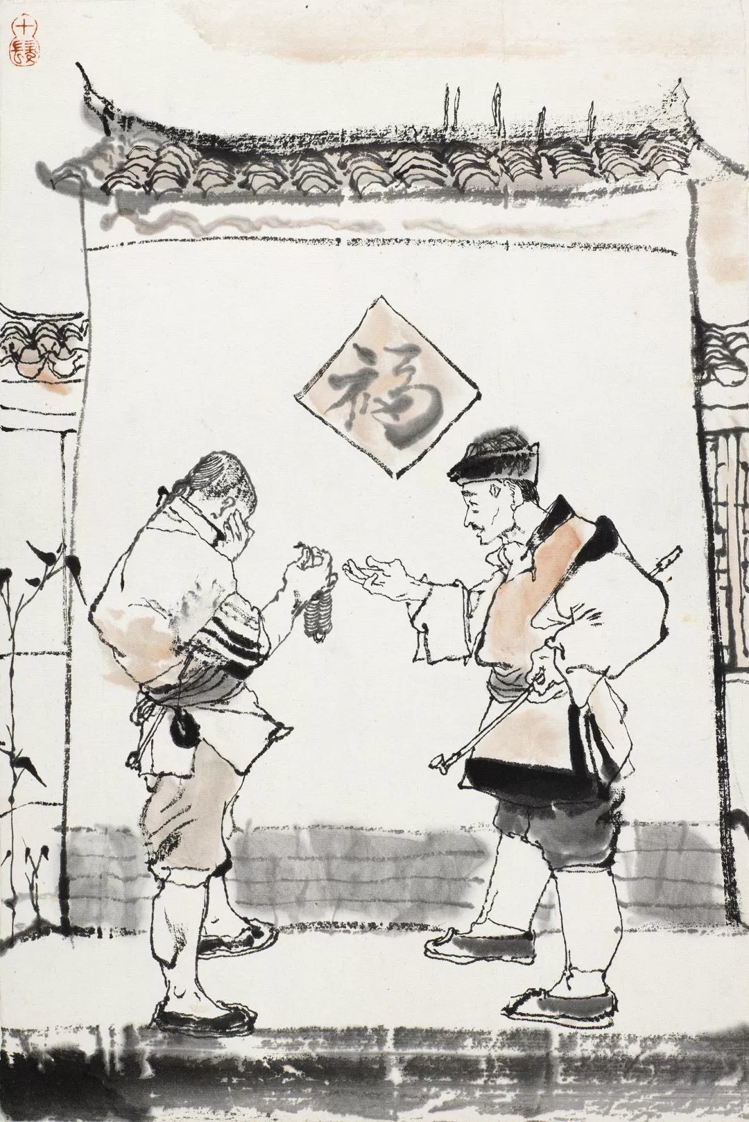 程十发又在此基础上,为建筑染上一层淡墨,进一步丰富了远离氛围的表达。为了在满幅构图中增加虚实相生的变化,程十发特别在画幅左上方采用了留白虚化的方法,与天空及下方墙面的留白连接以平衡画面。