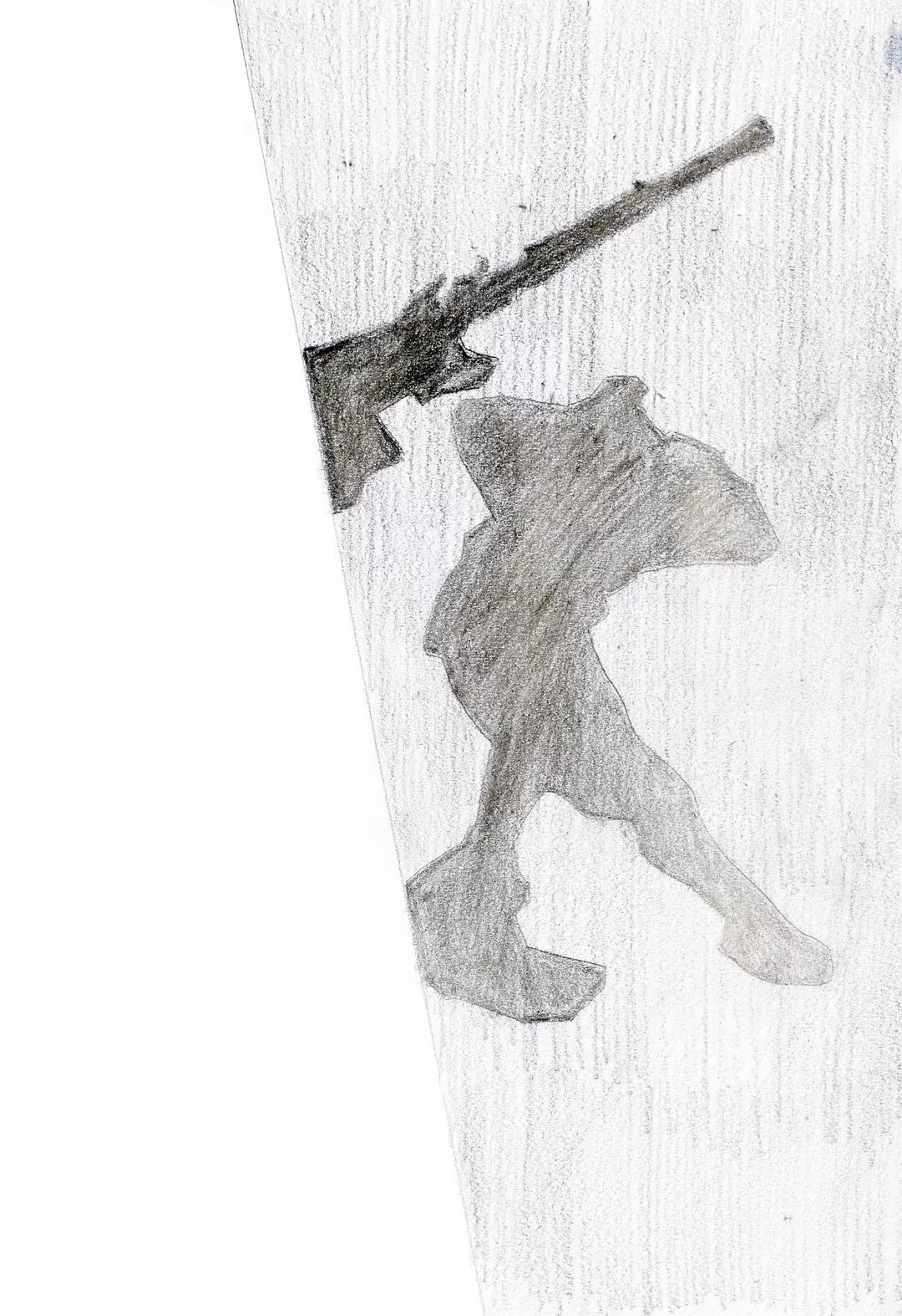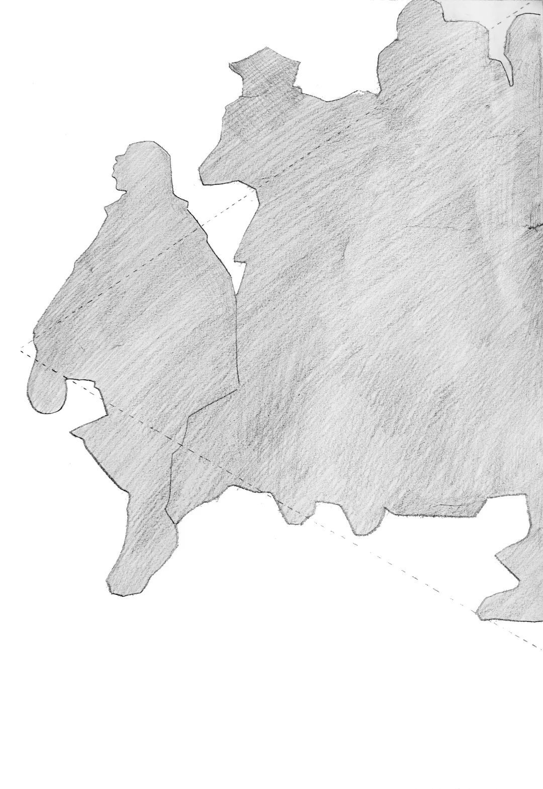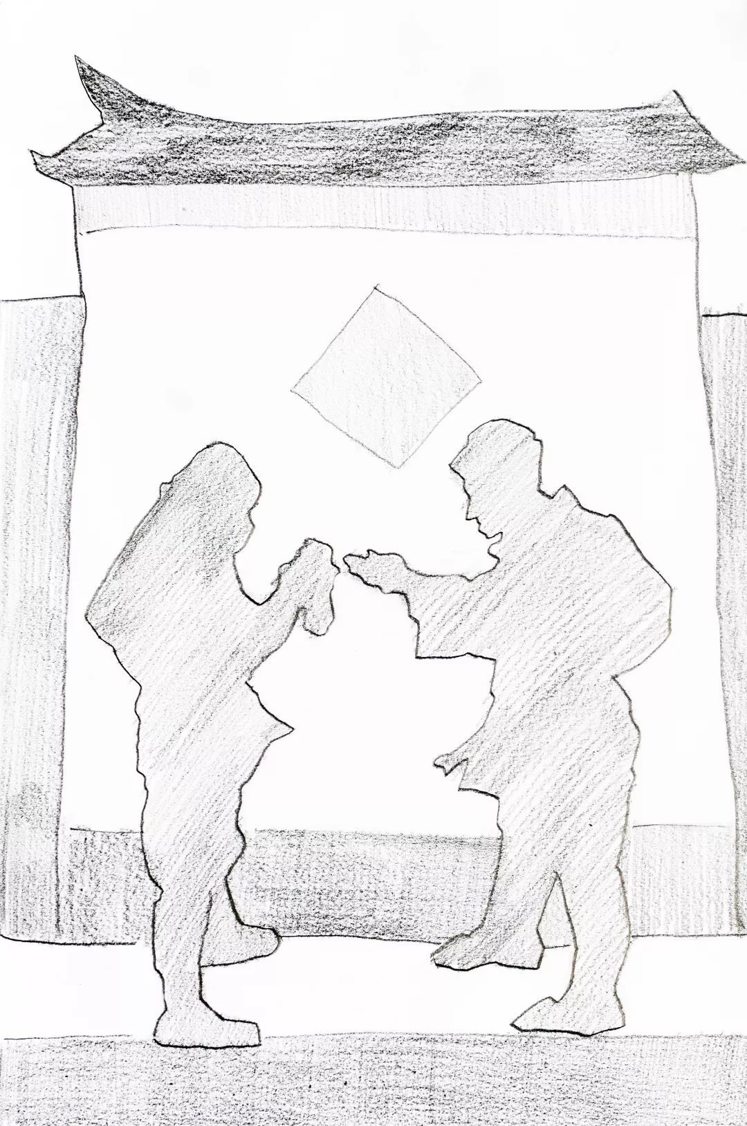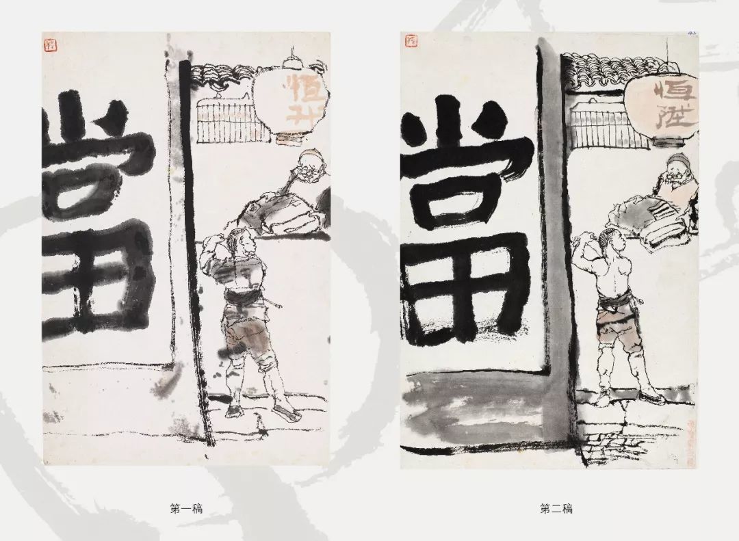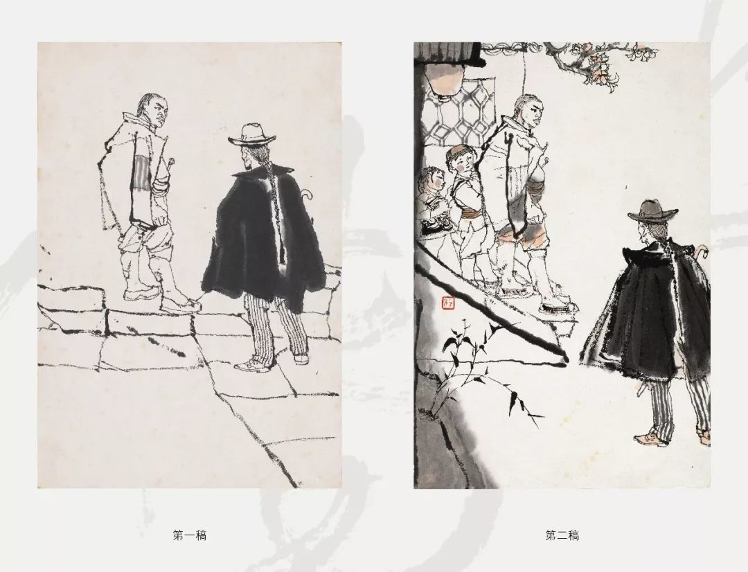 第一稿所画的两个主要人物已刻画完成,并绘制了地面石阶,此时程十发突然停手不画是基于何种创作考虑?对比左右二图可以发现,第二稿中两位主要人物的高低位置及距离与第一稿相比做了一些调整,程十发通过拉大画中两人高低距离,更好地表现了人物间的紧张关系,对营造画面主题氛围起到了升华作用,而将“假洋鬼子” 画出画面以取平衡,使得构图更加协调,此外舍去“假洋鬼子” 脚下石板路,则更凸显出了主体人物。
