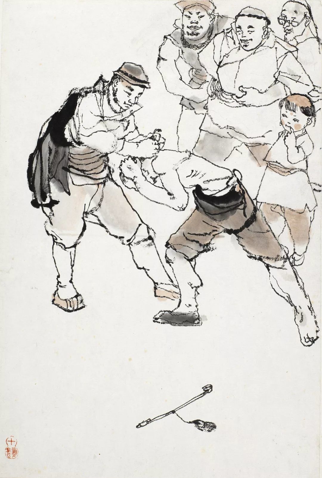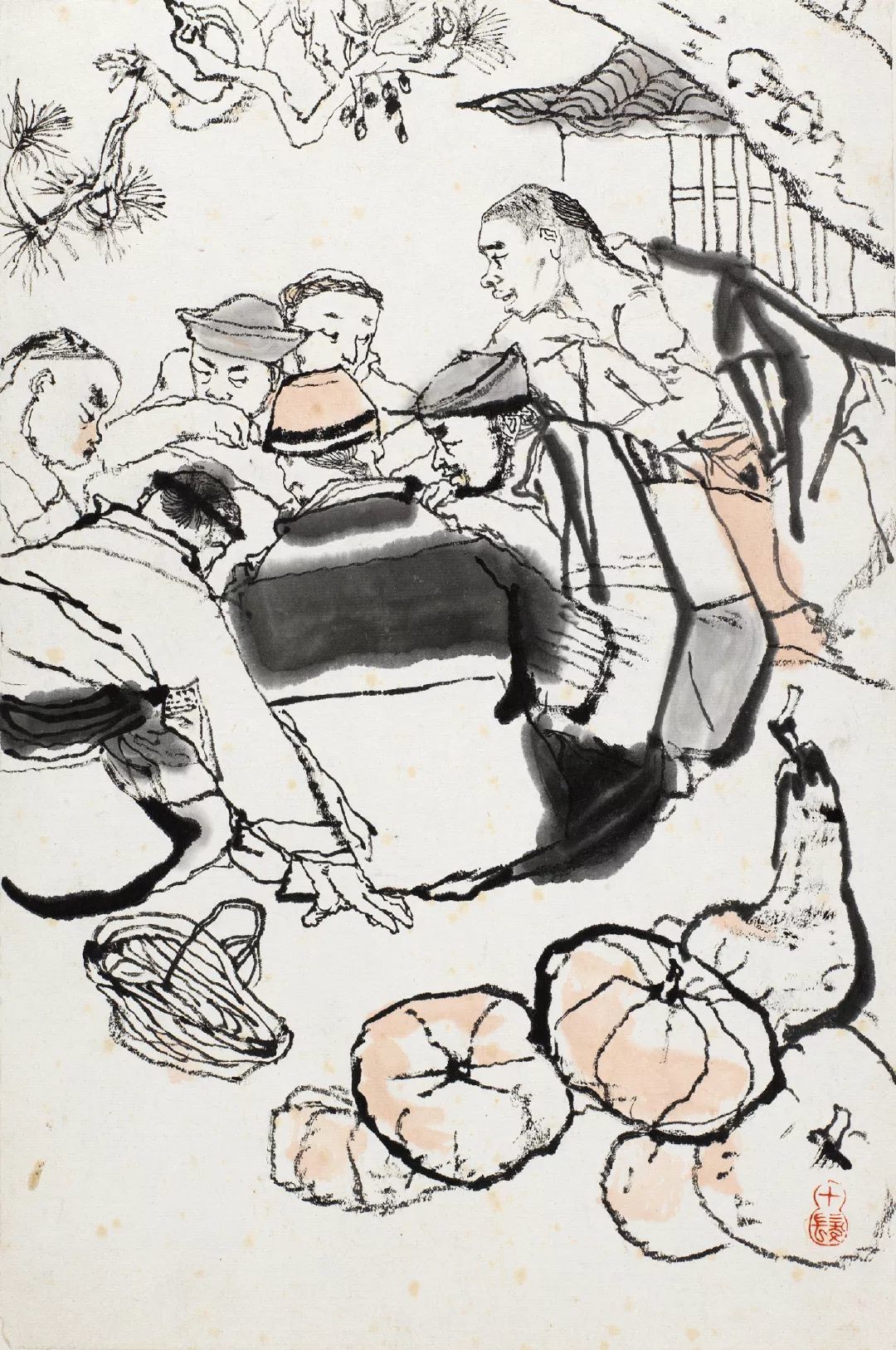 阿Q身上是有赌性的,一旦有了一些小钱,他会钻进赌徒的世界里,声音高亢、神情兴奋,人物围坐在一起,聚精会神盯着筹码,此图便是描绘此类场景。程十发对这一群像的描绘,一方面是通过人物的表情刻画其赌性的一面,一方面通过右下角随意堆叠的南瓜,隐喻与阿Q混迹的都是乡间百姓的底层身份,这种静物的描绘不完全是为了画面构图的补白或填空,而是程十发在对原著深刻剖析理解后,内化为自己笔下的形象灵感,其有关阶层的寓意形象亦随之呼之欲出。