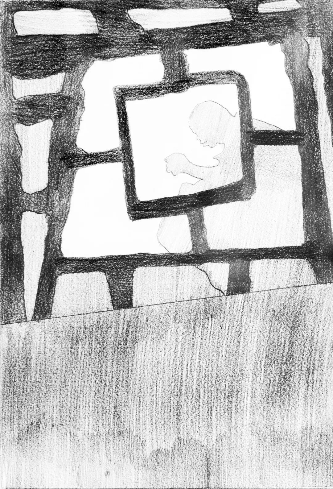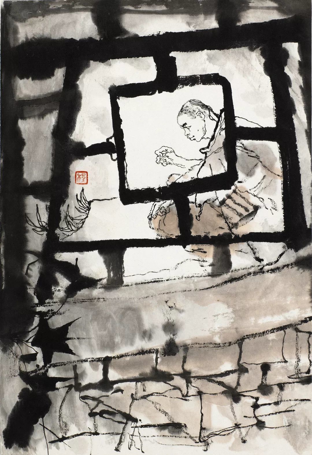 一幅画的构图中心事实上承担着两个使命,它不仅作为构图处理上的主要焦点,而且也应当作为最清晰地表达内容的手段,只有两者吻合一致,构图才能获得最大的表现力。此张作品程十发巧妙地运用窗户的“回”字造型,将“回”字形的最中心位置,留给画面的主人公,从而突出主体位置,有强烈的视觉冲击力。还有一类比较典型是通过“蜘蛛网”的形式,来引导画面中心点,无论是“回”字形还是“蜘蛛网”形作前景都是通过“聚焦”的方式来确定一点来使观众直观“靶心”。这样构图增加了画面的纵向对比和装饰效果,营造一种神秘气氛,使作品产生深度感和极其强烈的透视效果。