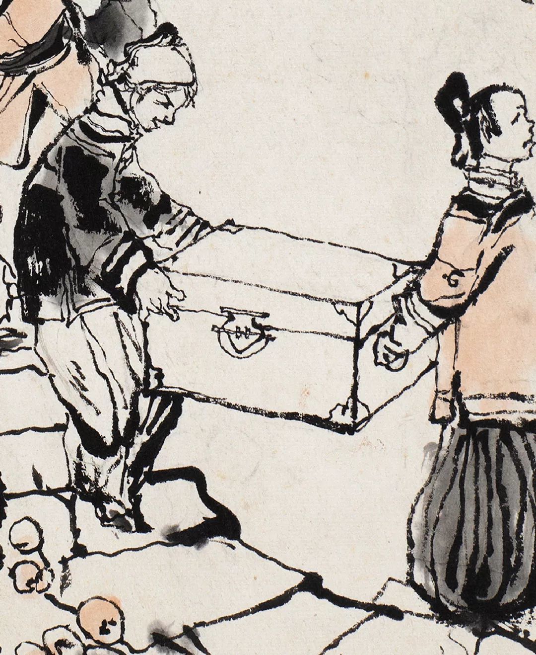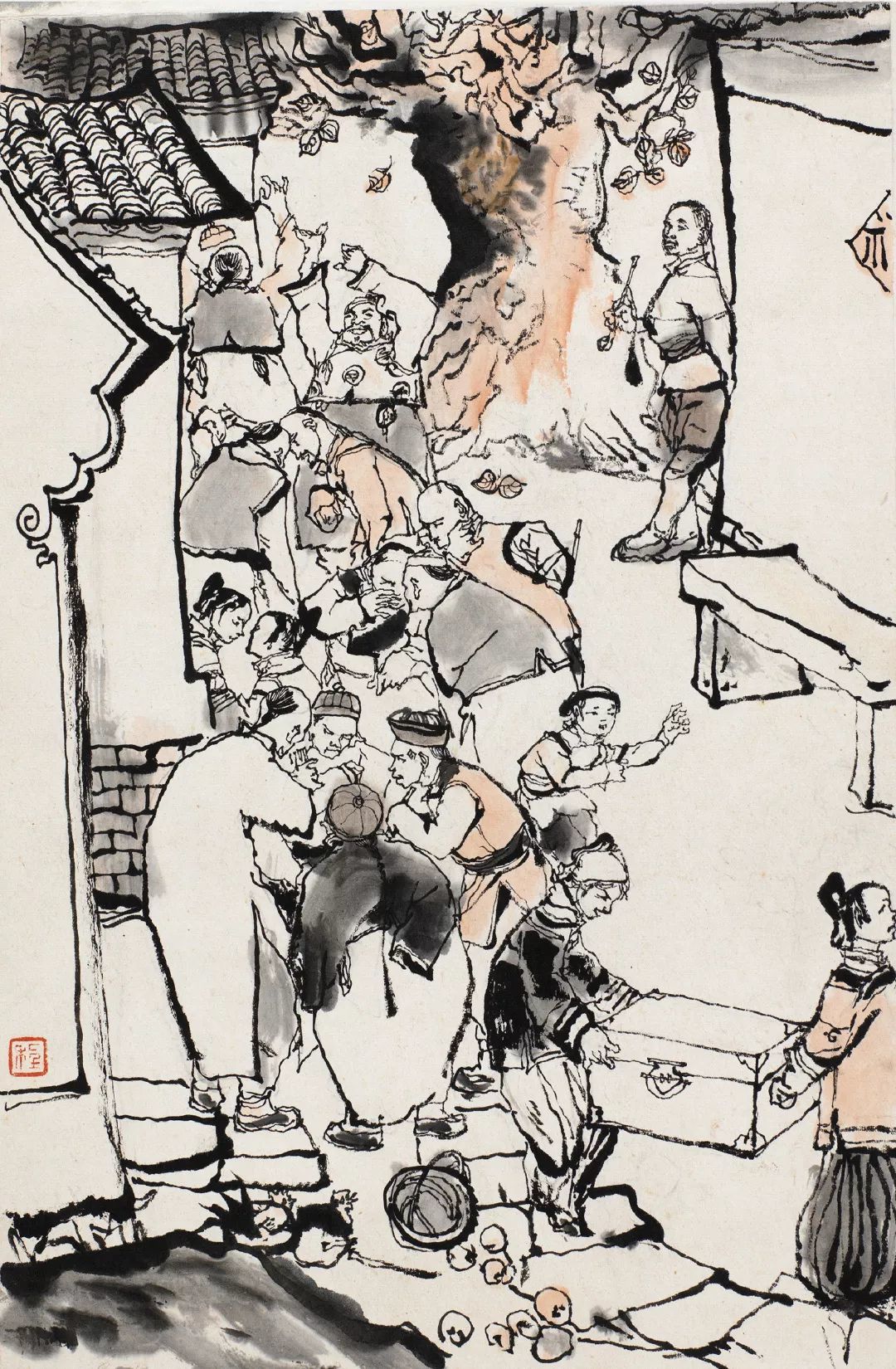 这一幕展现了举人老爷为避革命党风头而举家来未庄并差使家仆忙不迭地搬拾行李的大场景。画面中既有抬着行李的家仆,也有围作一圈议论的三五人群,既有凌乱落地的水果篮子,也有不明方向奔走的小孩,更有仿佛听到了一丝风声鹤唳惊吓得连帽子都惊地掉下来的。程十发用夸张的笔法描绘未庄人群的不安与惶恐,这种描绘与远处悠闲地抽着旱烟的阿Q形成了对比,此时阿Q俨然一个看客的形象。整幅画面人群排布动中有静,并用直接描写的手法,将人物的情绪动态与喜怒哀乐袒露无遗,从而营造了一种慌乱、没落的氛围。