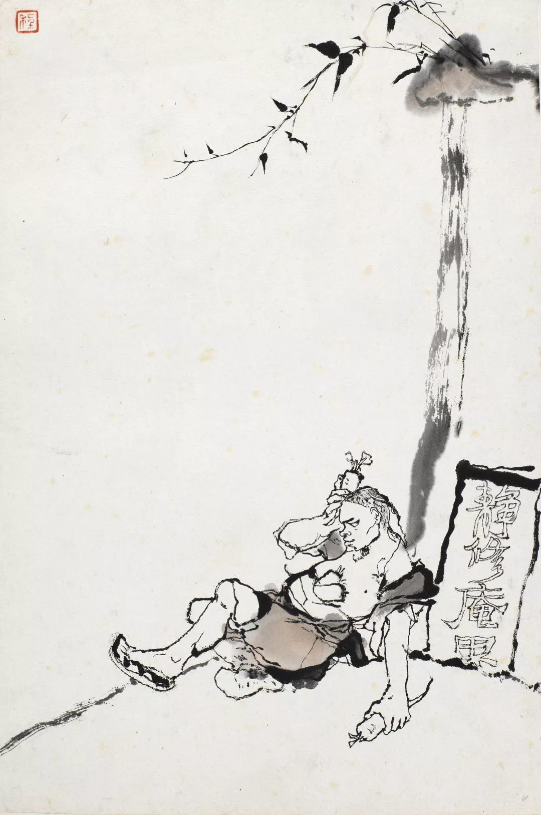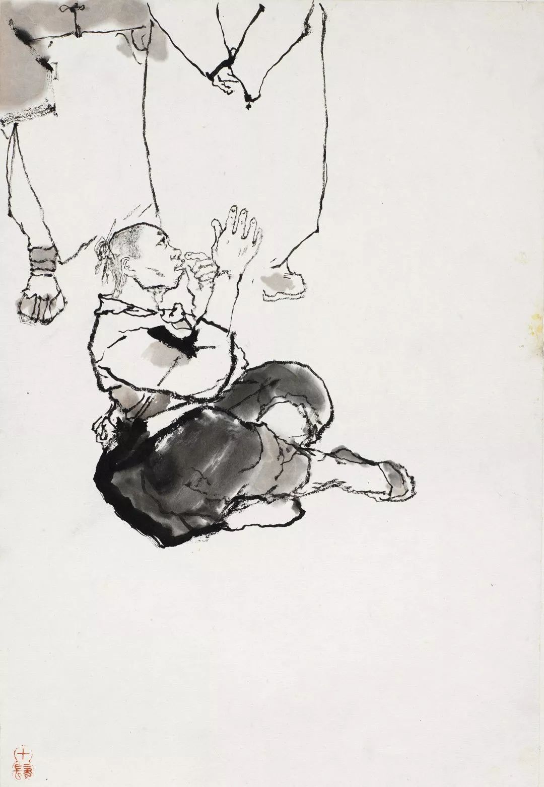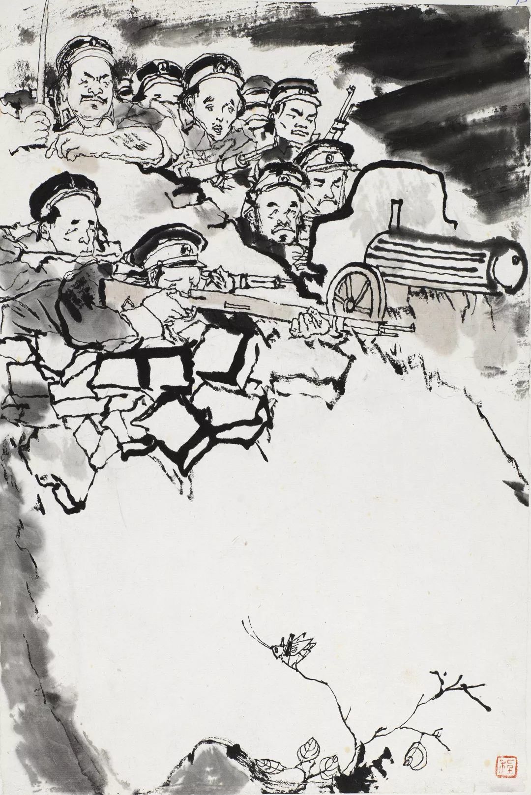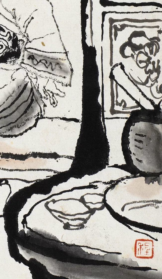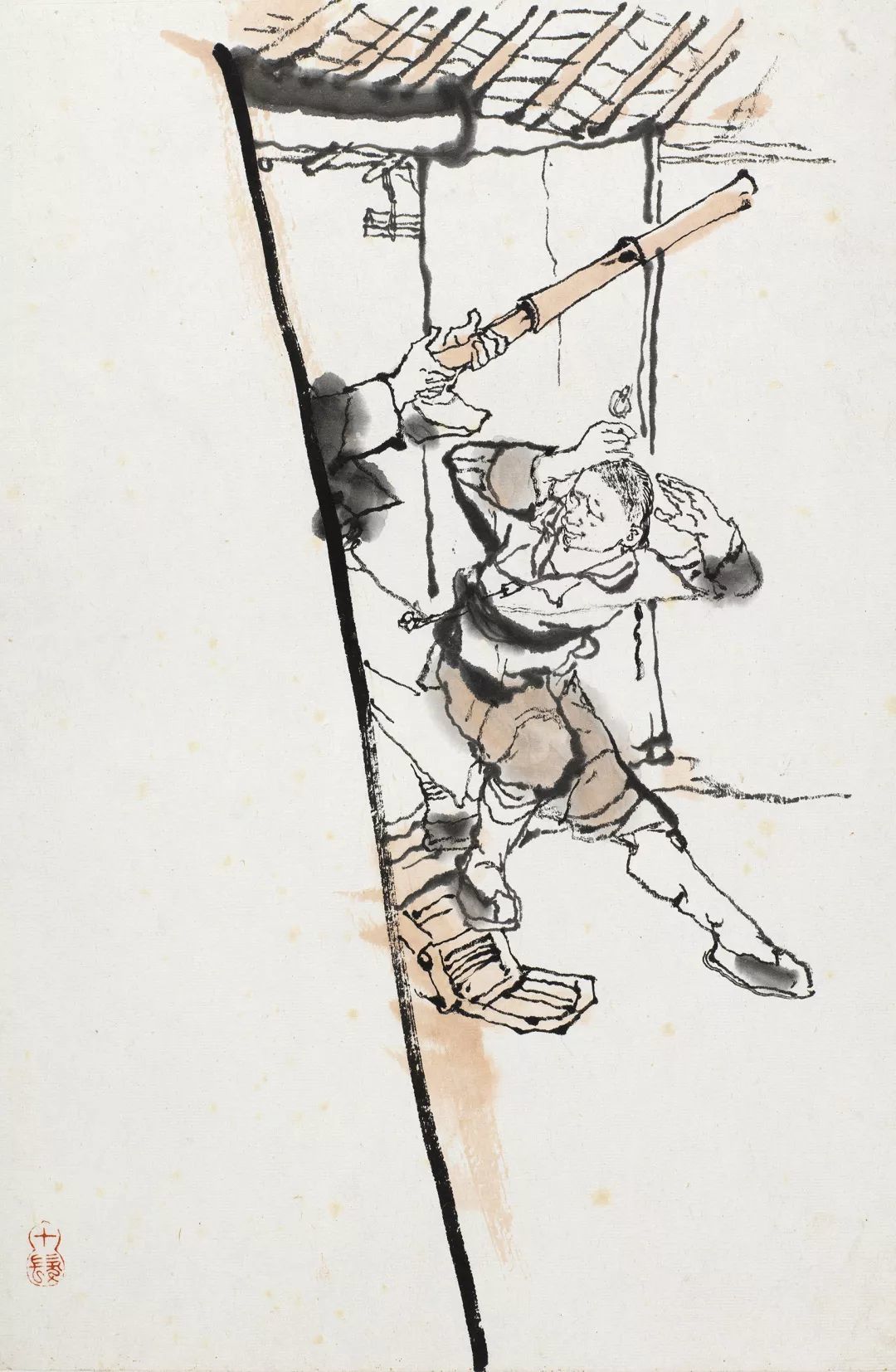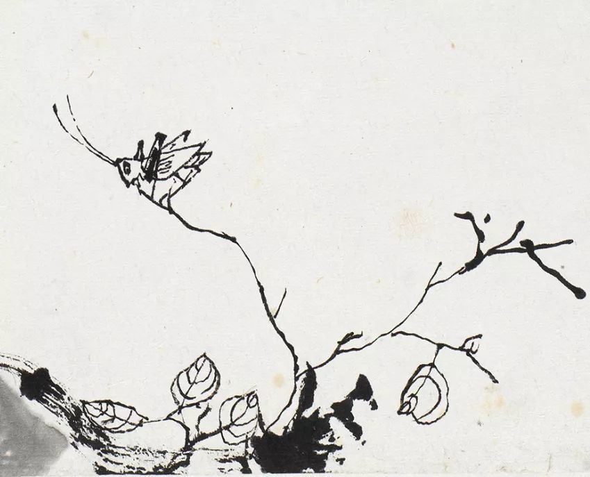 程十发的线条不同于流畅飞动的铁线描或高古游丝描,他的笔墨线条是具有金石意味的,线条的起伏转承大,这得益于他的书法练习,故所作形象没有轻飘浮滑之感。他很好地运用了生宣具有艰涩性这一特点,并利用纸张的艰涩特性,使得毛笔在行笔的过程中获得阻力,而下笔时的轻重缓急所产生的枯湿飞白变化,则造就了人物的虚实体感、使得线条获得了苍涩有力的质感。这张作品下笔果断多变,只以墨色为主,黑白分明且层次丰富,豪放之中见细节,爽利的线条赋予人物以生命力和力量感。用笔以方直为主勾画人物和墙体,给人印象深刻,墙头下一只细笔勾勒的蚂蚱仿佛是阿Q自己,随时会被消灭一样,更多了一份笔墨隐喻性的内涵。