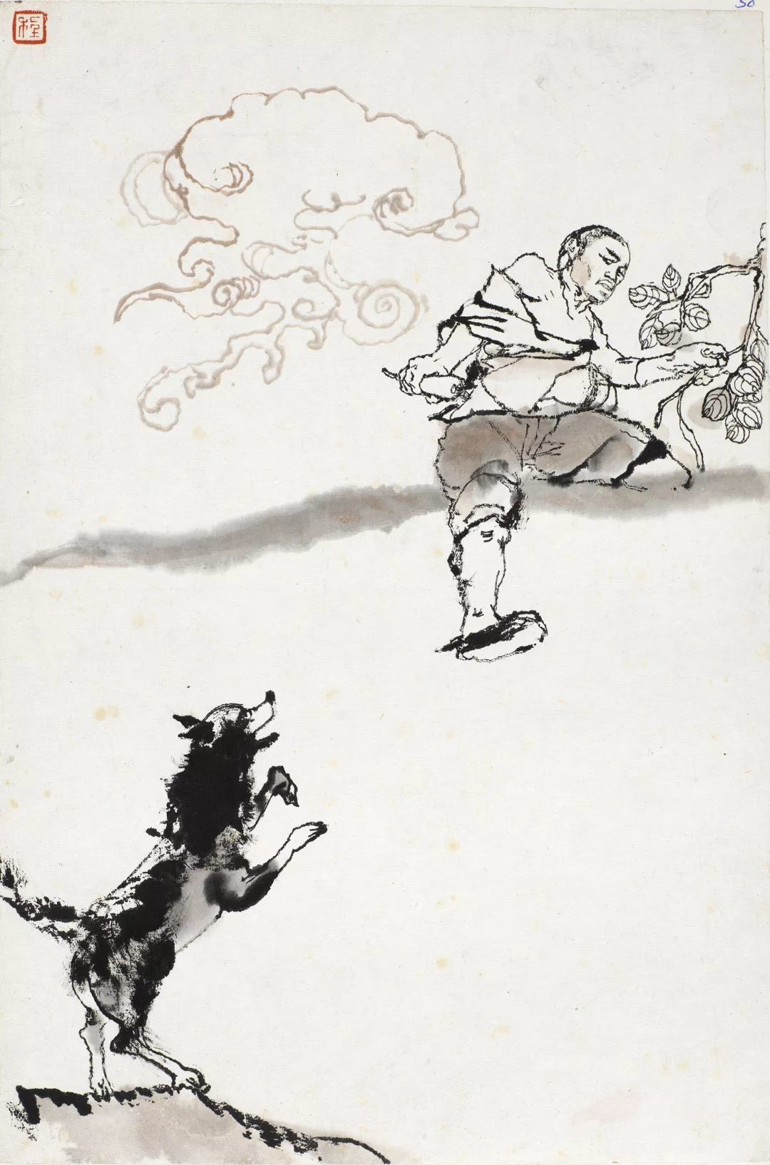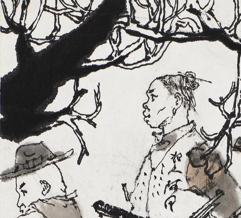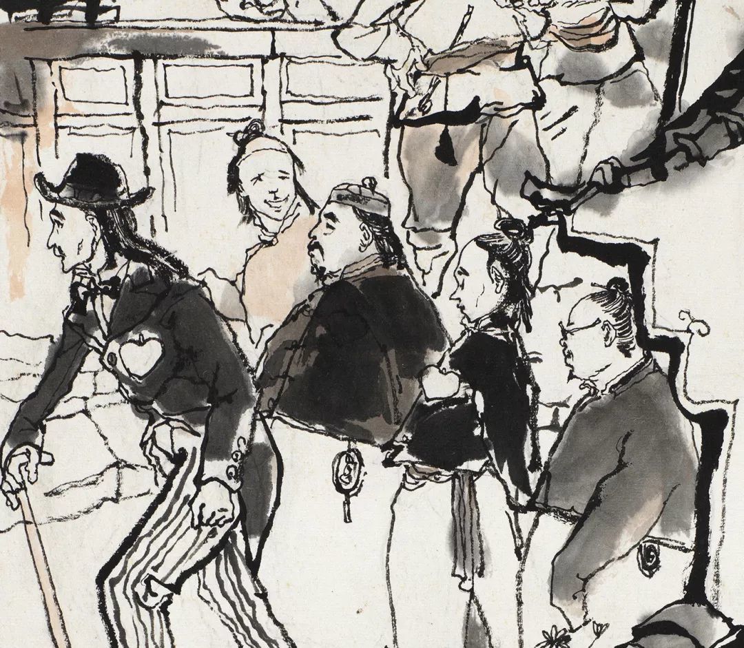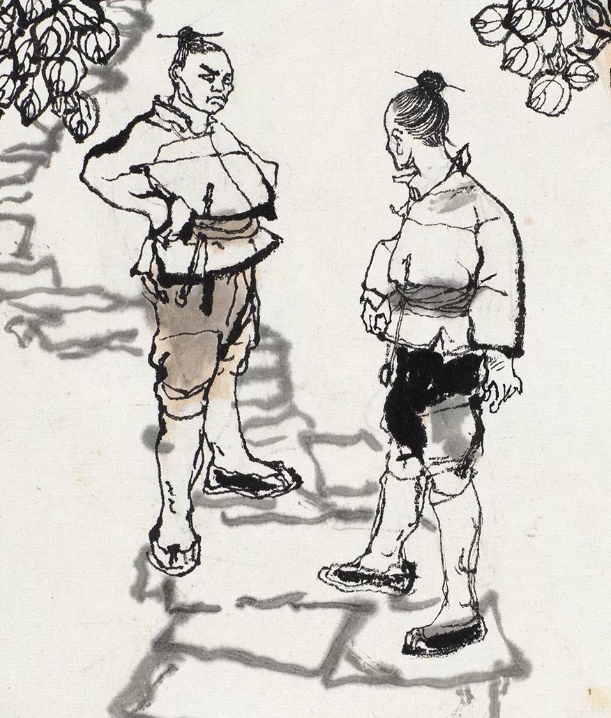 重新构思的大门台阶背景为紧接着的三十、三十一画做 了场景延伸,并形成强烈疏密对比关系。此外,程十发在第二稿创作中保留了第一稿创作中精妙的人物笔墨对比关系,阿 Q 主要以干墨勾勒,而“假洋鬼子” 则以湿墨大笔涂写,对“假洋鬼子”辫子周围的留白处理,彰显了作者去粗取精的笔墨思考,甚至有意将“假洋鬼子”的外套画大一些以表现其“飞扬跋扈”。