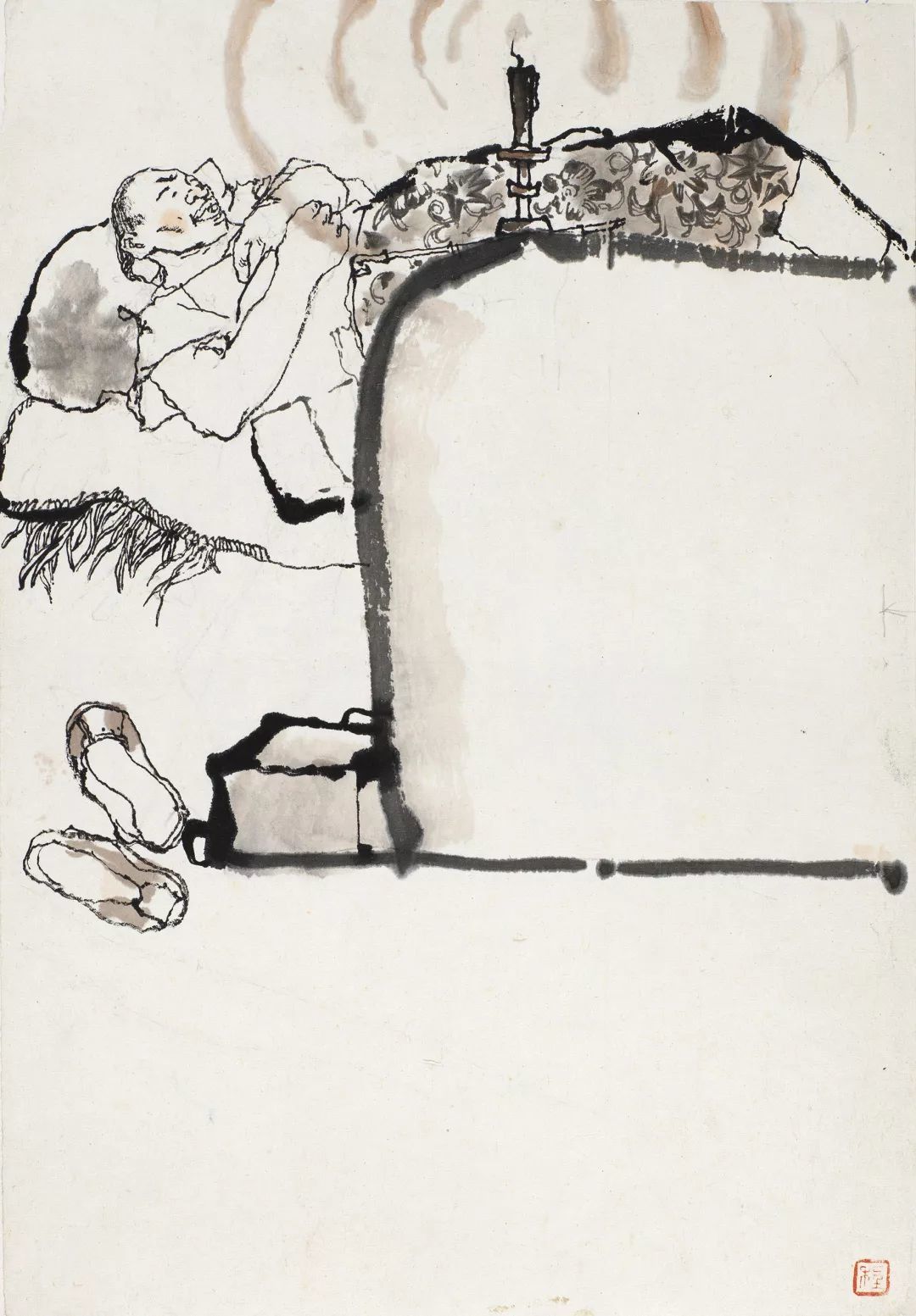 在《阿Q画传》的作品中“一角”和“半边”式构图得到了巧妙运用,这样的构图特点是主体形象少,画面简洁,有一大部分显得虚空,以"计白当黑"的手法,将留白提升为一种创作技巧。这种构图所呈现的笔墨虽少,但却有笔墨所不能企及的意境,空白区域让画面多了一些戏剧性效果,虚实对比也因此变得更加强烈,使画面产生以无胜有的效果。这种构图的运用把富有感情色彩的人物加以突出,使画面情景交融从而富有更深刻的含义,是对连环画和水墨人物画的发展和丰富,既精确表达阿Q个人的内心生活与其在社会背景下的凄清境遇,也敏锐地反映那一时代社会一类人的精神状态。