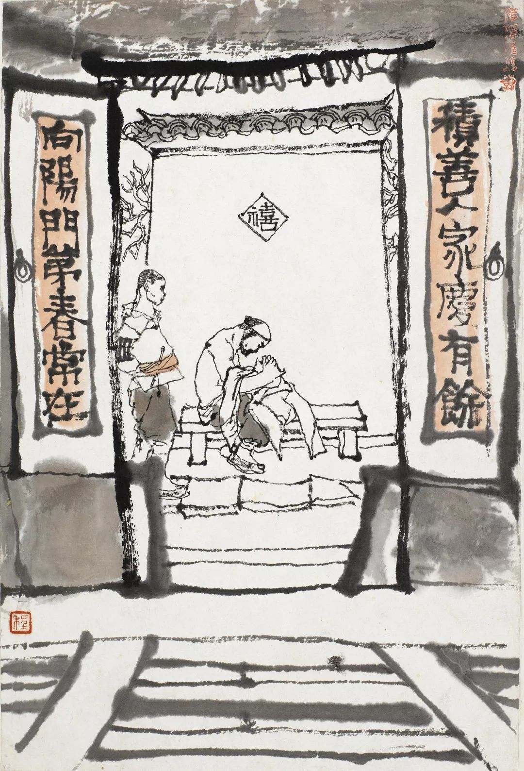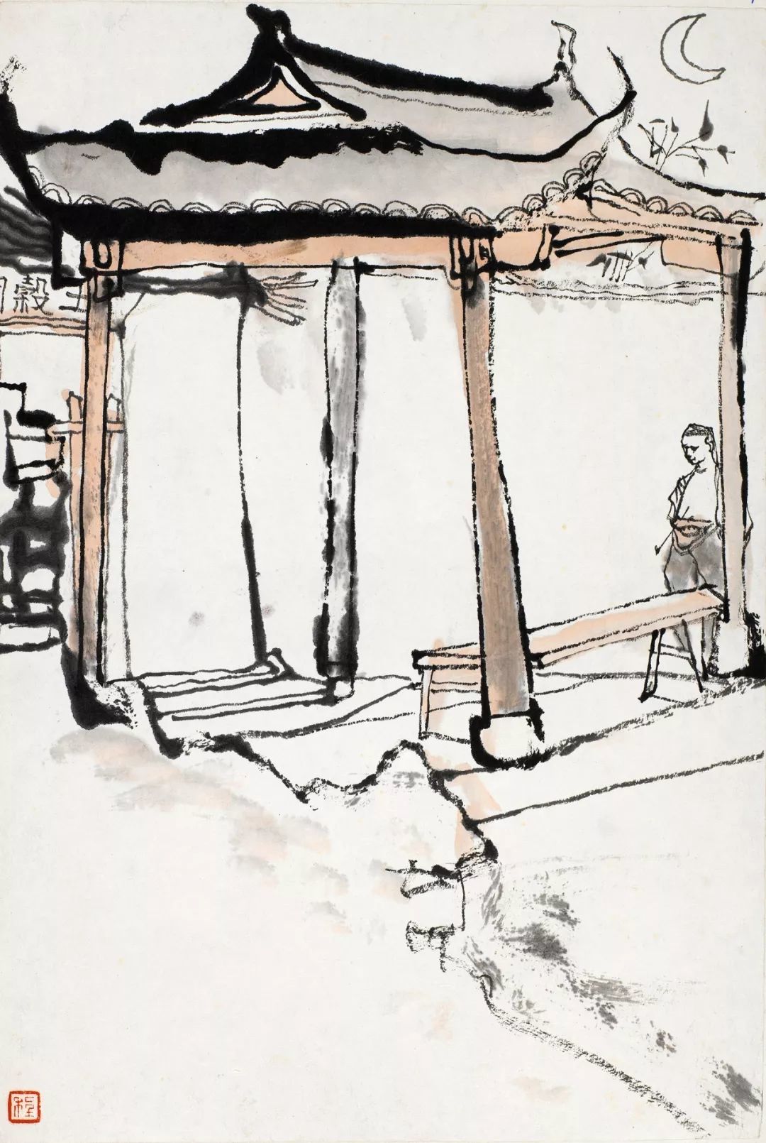 此幅作品以未庄土谷祠建筑及其门亭为绘画对象,通过枯湿浓淡交替变化的线条与墨色的转换,构建画面叙事语言以辅助主题表达。程十发仅用几根枯湿相间的线条即勾勒出廊柱的建筑结构,既分割了画面,也通过这几根线条的变形处理,打破了一般建筑的规整与单一,使画面的绘画性语言更为丰富。为表现月下建筑的阴阳两面,程十发在迎光处以细劲线条处理物象,而在背光处则以稍微渗开的墨笔抹出飞檐。程十发将主体建筑置于画幅上中方,而以留白的方式虚空左下一角的石阶,形成上重下轻布排结构,避免了背光处可能带来的暗部过暗问题,并与画面中心及夜空留白相呼应,更有利于将观者视线向中右方的主人公聚焦。