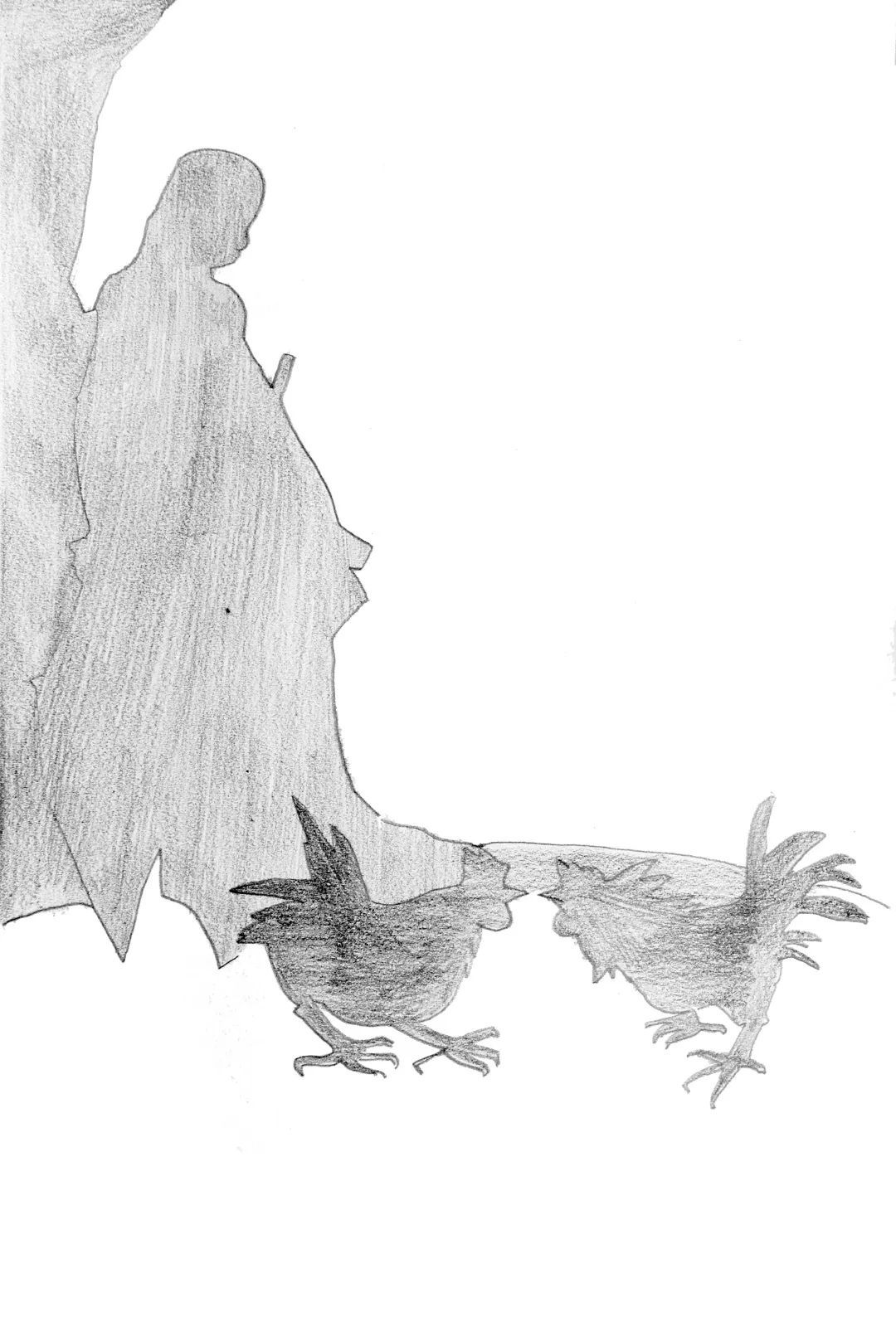 L形构图法是由垂直线与水平线交汇而成,有正L形、反L形和正反倒L形几种L形构图形式,属于一种边角构图形式。以第28图为例,这是一张较为典型的L形构图法,主人公阿Q竖直站立于画面左侧,形成一条竖边,横向两只打斗的公鸡则形成了水平的横边,两线交叉给人一种稳定、安静和延伸的感觉。