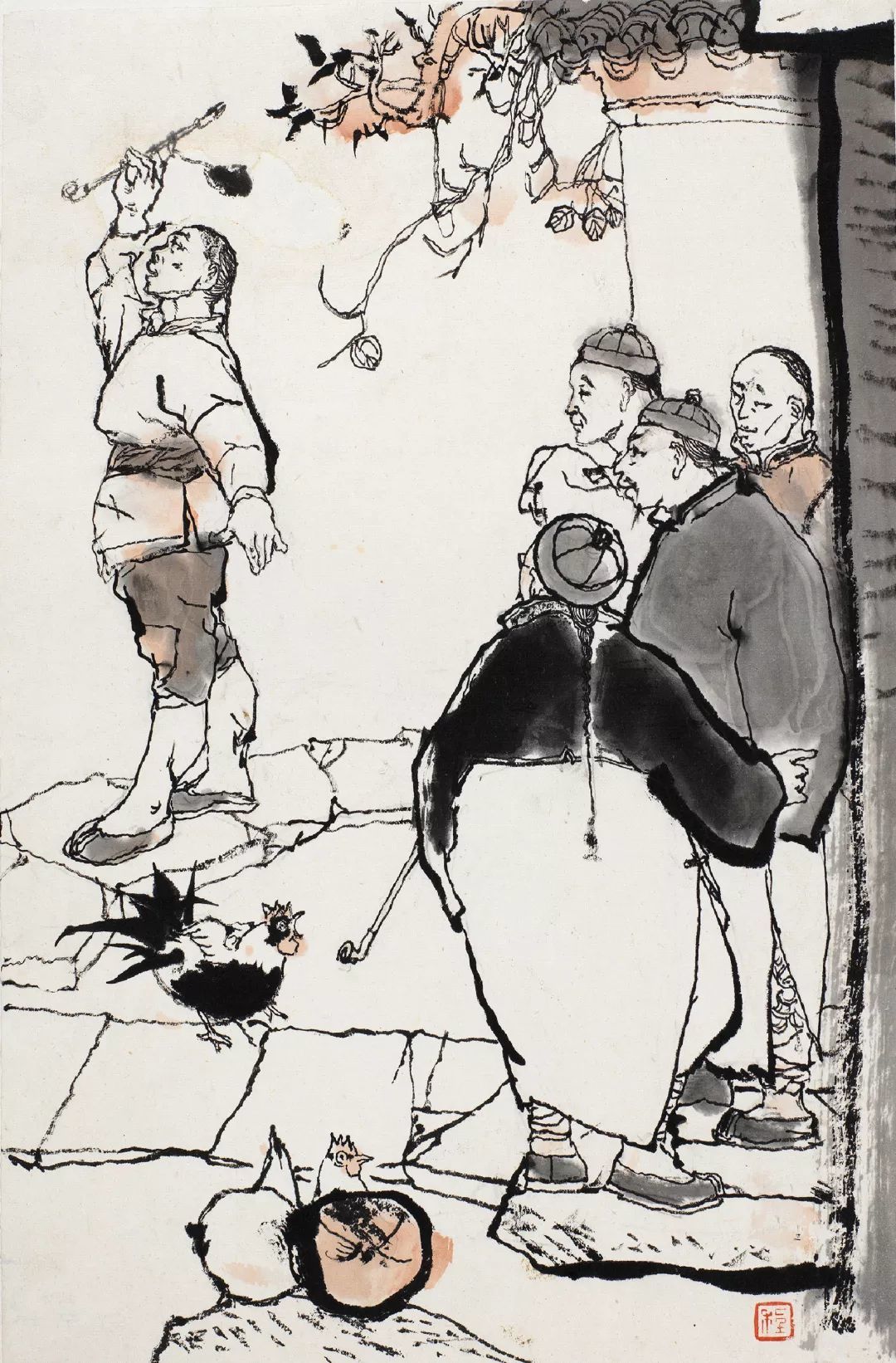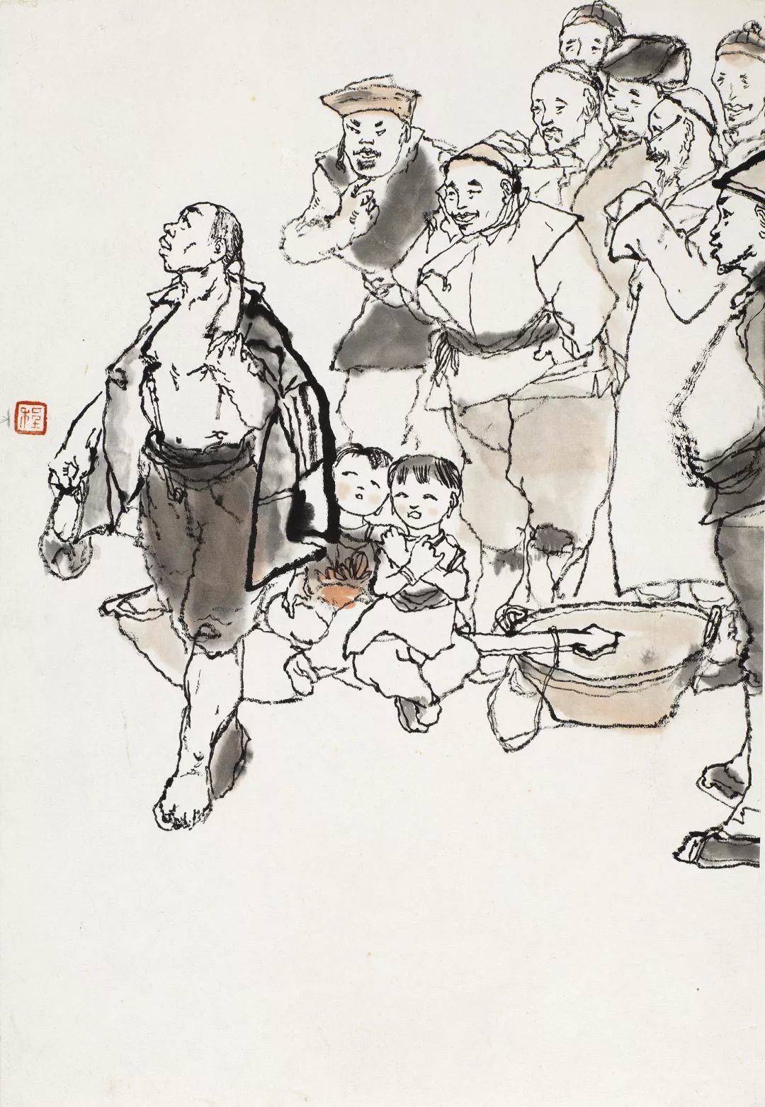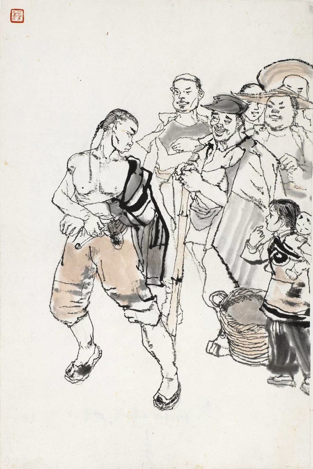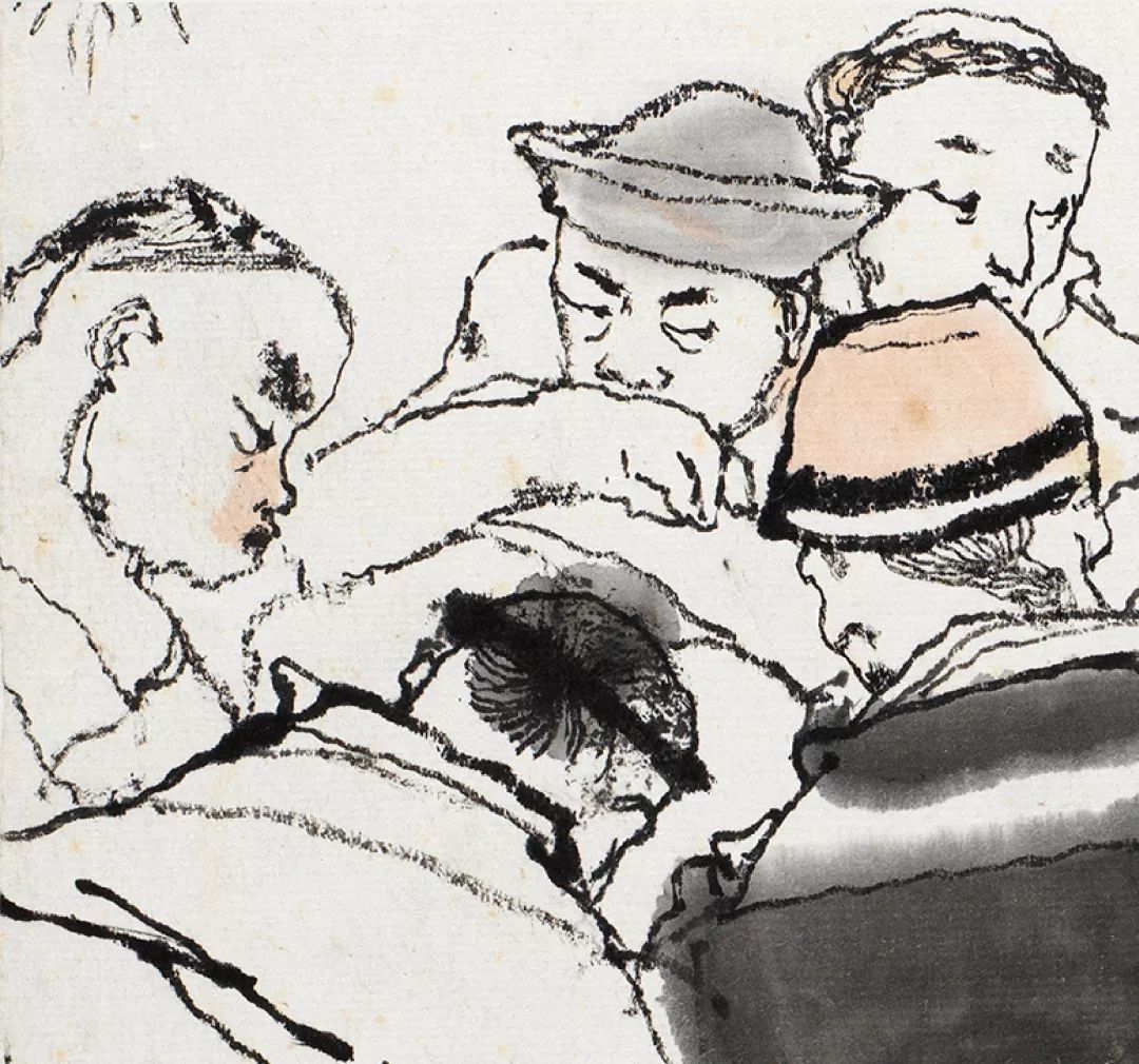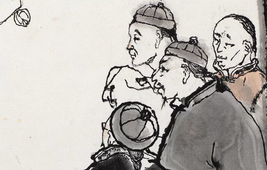 细细阅读《阿Q画传》就会发现,它的每一幅图都是一幅精彩绝伦的中国人物画。通过他的个性笔墨,把中国人物画的豪放激情发挥到了极致,行笔用墨游刃有余、挥洒自由,枯湿浓淡,繁简徐疾,无不浸润着浓重的情感色彩,以全新的面貌推至前无古人的境界。下面将为大家重点解析程十发《阿Q画传》中的未庄群像。