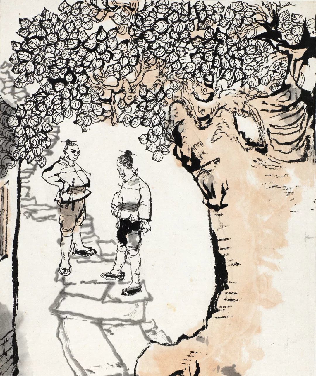 这套《阿Q画传》中的线条丝毫无刻板的感觉,观察其线条,时而如狂风骤雨,时而如缓慢沉着,因其多用湿笔且于生宣作画,因而笔墨线条变化大,非但没有破坏画面的完整性,反而使得画面具有大开大合的笔墨气质,画面单纯且毫无火气。此张是程十发对线条进行多种不同组合的阐释,右侧的一棵大树几乎全以线条勾勒而成,但是各部分却以不同的组合方式而区分开来,首先是叶子,以浓墨细笔的线条勾勒得密密麻麻,形成一个整体的大面,树干以空勾伴有少量结构线画出,用笔相对率真,紧接着以赭石色晕染,没有全部涂满,让其有轻透的感觉,画中的石板路则以细笔淡墨写成,层层褪去,富有空间感。