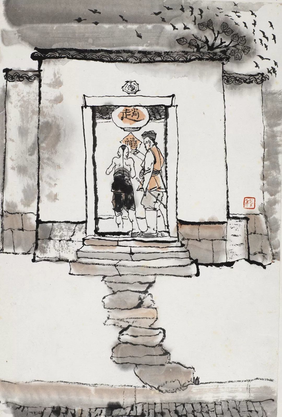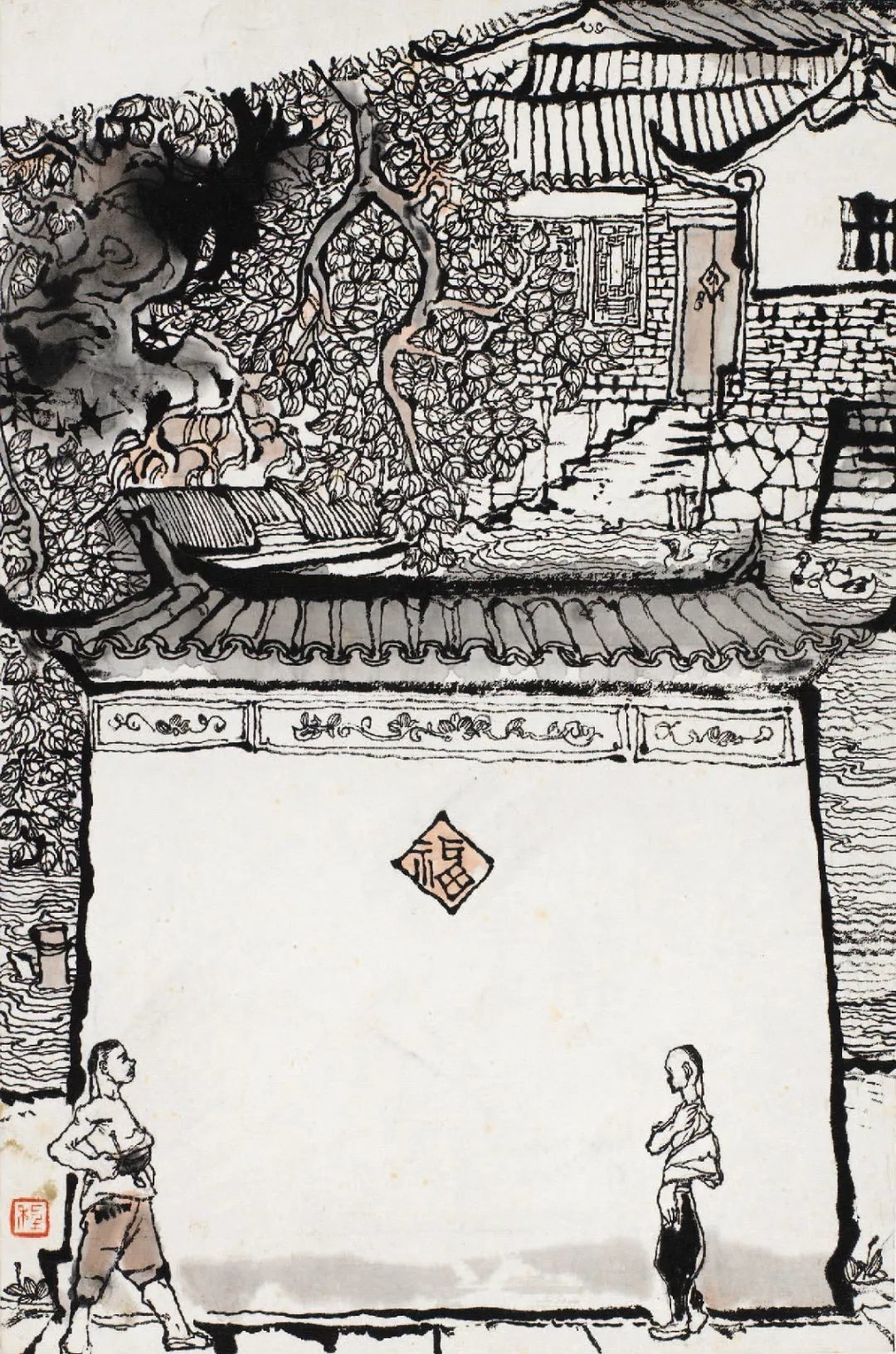 缀物布景,恰到善处。典型性格总是生活在典型环境之中。程十发画的阿Q,之所以使人感到逼真,还因为他真实地描绘了未庄的自然风光。《阿Q画传》主人公生活在江南水乡错落有致的街道老屋,照壁院落以及随处可见的大树小桥,残砖端墙之中,自然融洽,浑然天成,一群飞燕抑或一只南瓜,不但起到了烘托主题、渲染气氛的作用,也加强了画面的趣味性……下面将为大家解析程十发《阿Q画传》中的未庄建筑。