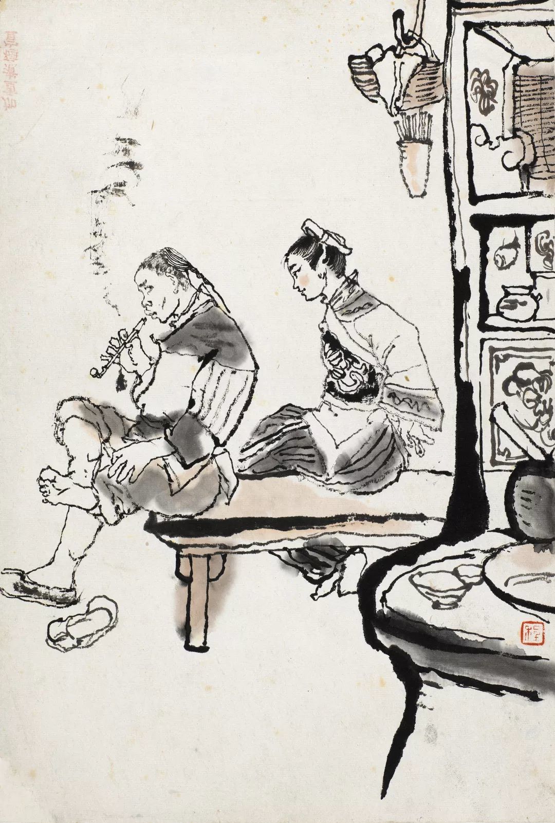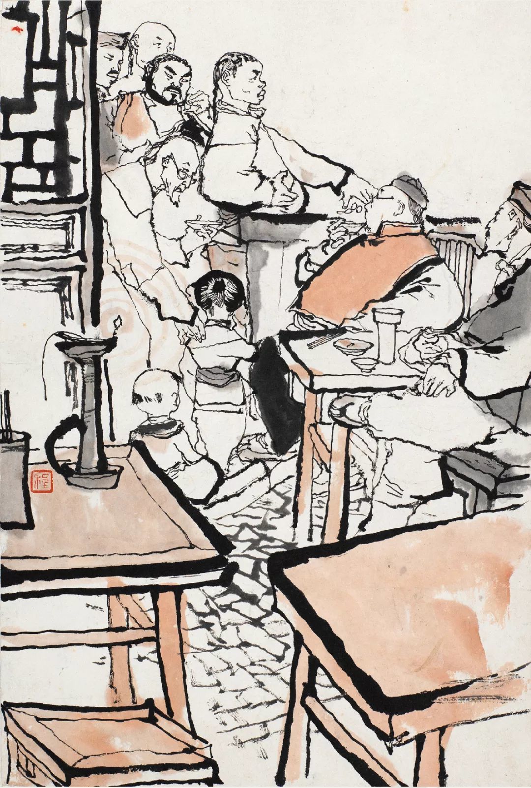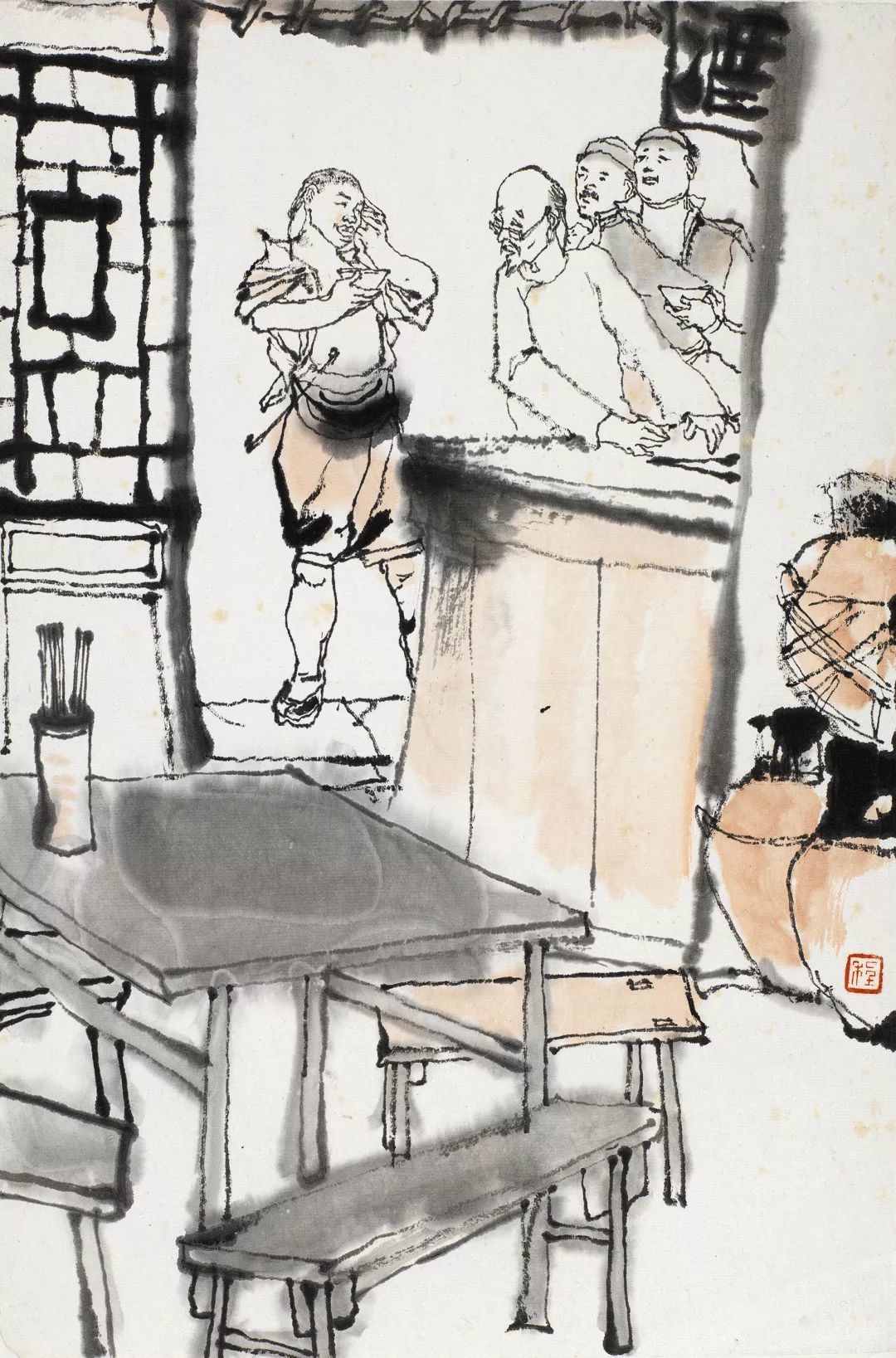 程十发在此套连环画中,往往多以干笔画结构线条,以湿笔大块涂抹,画面富有激情,给人痛快淋漓的感受,线条与块面交替出现,层次丰富。此张作品桌椅板凳以大块淡墨快速涂抹出来,用墨非常透明,尤其对中层次的墨色掌控得十分到位,与左上角以浓墨勾线为主的门窗形成强烈的视觉对比,二者包围成的空间,将画面主要人物以对比的方式转移到画面的最白处表现。整个画面形成了一浓一淡,一线一面,一枯一湿的节奏,程十发手中的笔和墨如同节拍器,调和着画面的笔墨节奏,这是程十发对点线面合理运用的结果。