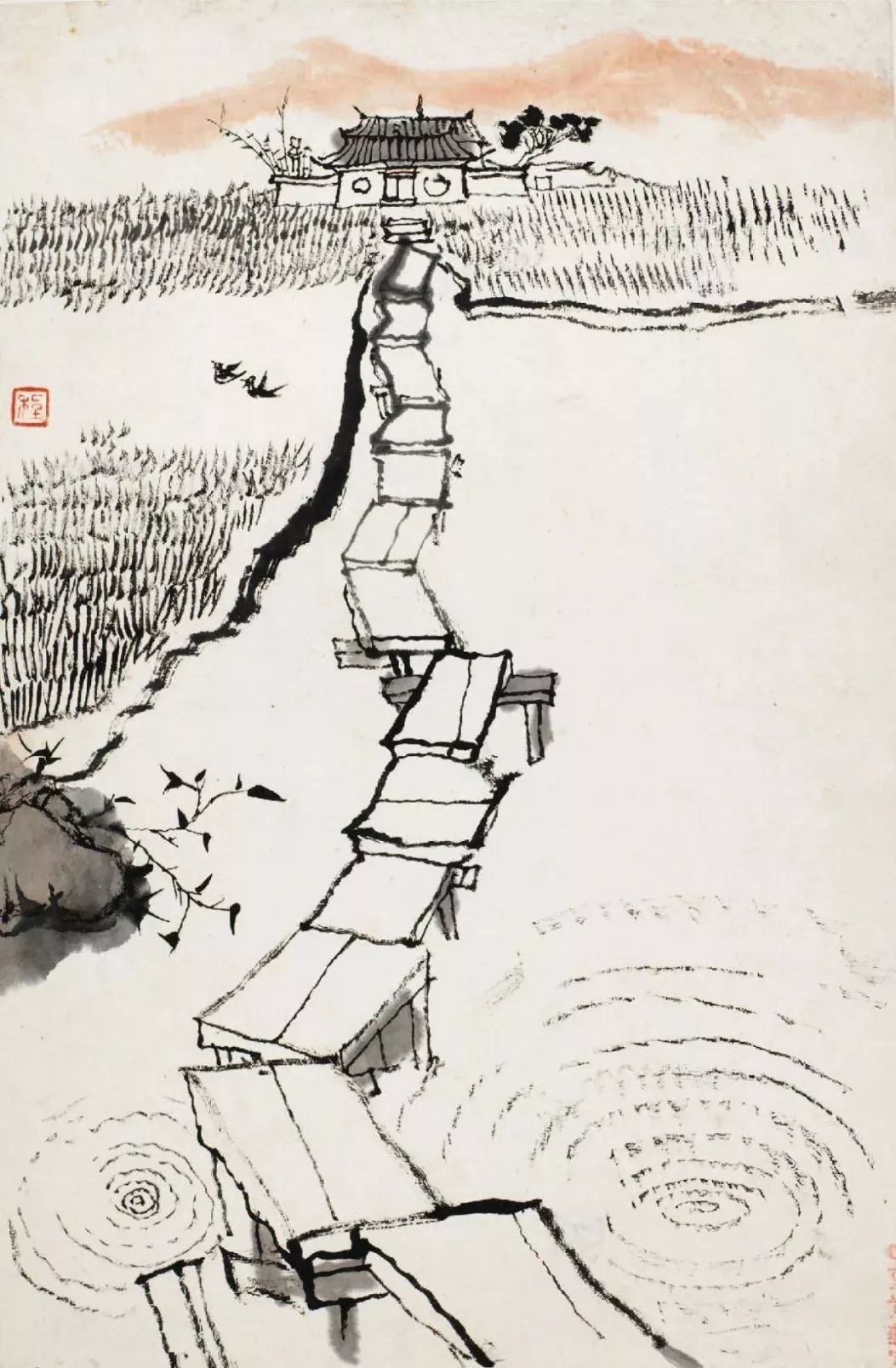 未庄村镇外通向静修庵的石桥,是平铺式的梁板桥,河塘中立石柱,柱上架石梁,无边栏,略成“之”字形,约有三折。程十发遵循近大远小的图绘法则,采用平远构图的方式布局桥与庵的连带关系。
