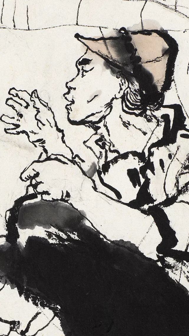 《阿Q画传》的用笔方式为中侧锋并用,技法丰富而完备。粗笔写意往往在细节刻画方面难度很大,对创作者的笔墨刻画能力要求很高,粗笔写意在细节刻画上的体现是一名画家水平高低的重要依据。此幅作品中人物形象结构的刻画非常严谨清晰而丰厚,在几笔平淡的刻画中蕴含了许多的惊喜,尤其是对肖像的刻画格外认真,墨色与墨色之间的大小对比,浓墨与淡墨之间的交融渗化,高度写实,嘴型和眼神的表现透露出人物的内心活动,虽处静态中却显得若有所思,把握住了人物内心的情绪变化。一缕轻烟也是绝妙,寥寥几笔尽显轻松自在。