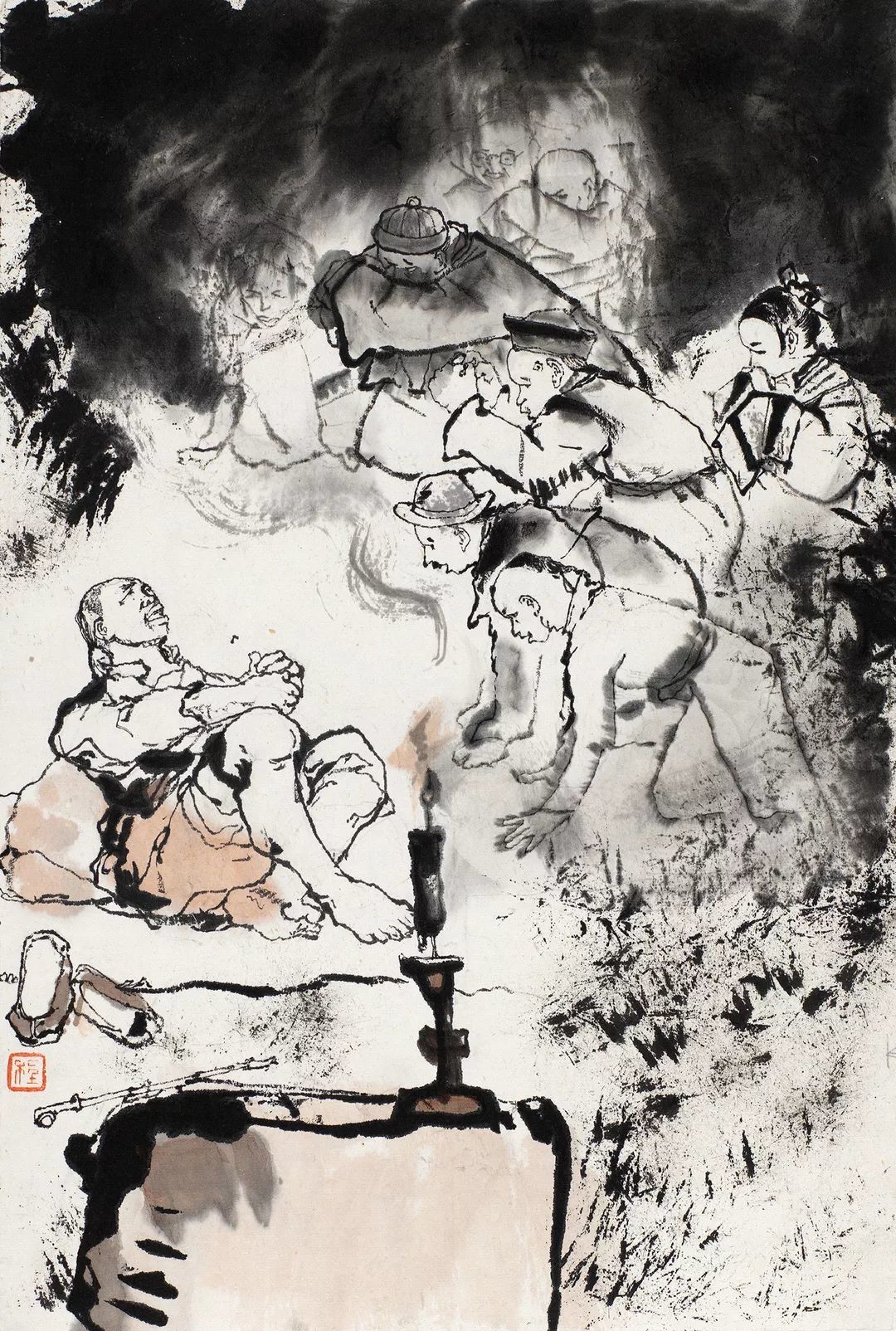 画面呈现了阿Q酒醉后于土谷祠床上半梦半醒之间的幻想画面,他依靠白天不明就里地自诩“革命”,获得了一种“高人一等”的自嗨。图中程十发以虚实对比的手法,描绘了阿Q脑海中厌恶之人卑躬屈膝的哀求貌,以及他自己高高在上、飘飘然的神情,一实一虚,营造出一种梦幻般的不真实感。而未庄权贵人群的渐次虚实,烛光的赭色、灰暗的场景,以及枯笔与浓淡泼墨的对比运用,又进一步加重了这种与真实脱离的虚幻氛围。