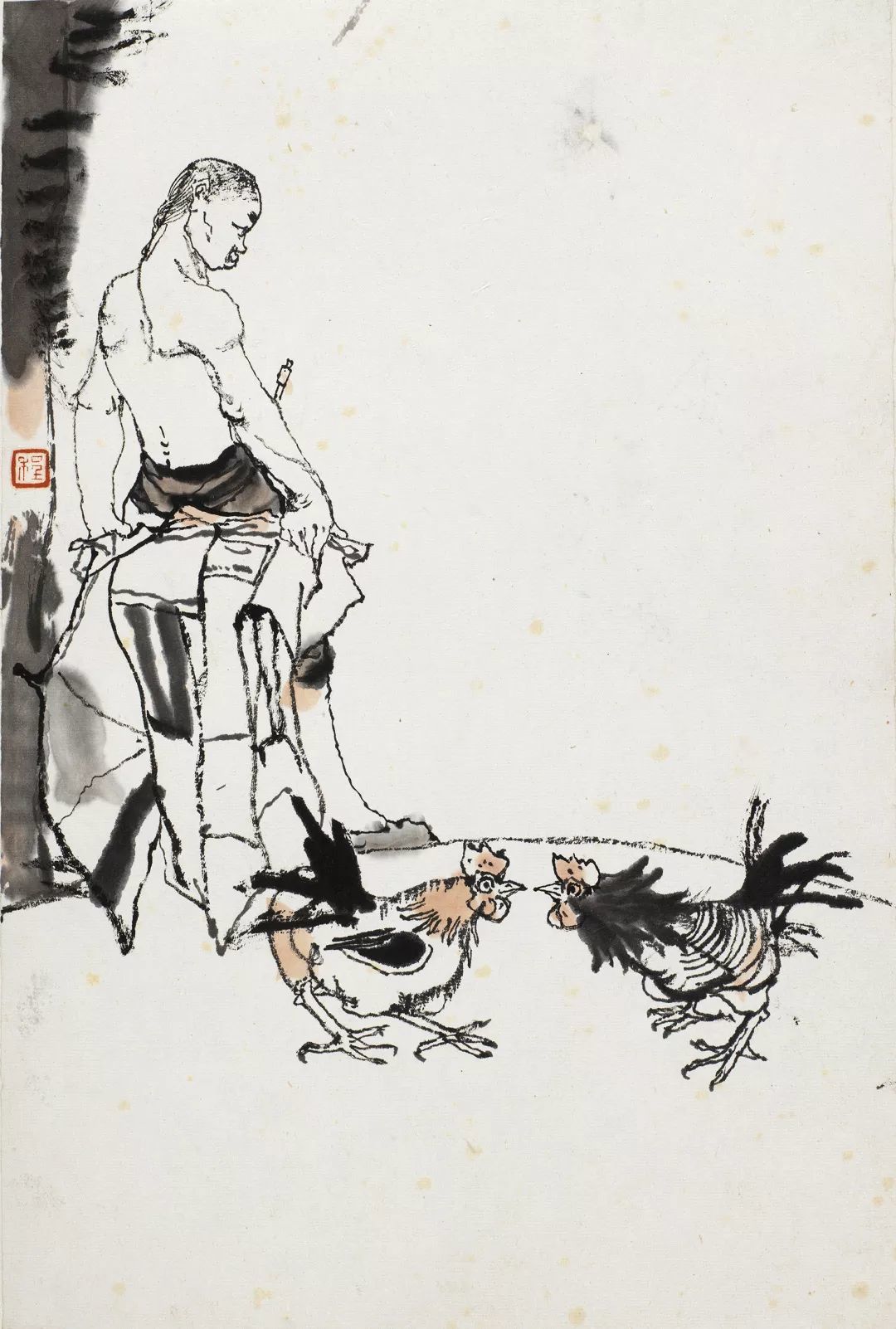 程十发的笔墨对比强烈,焦、浓、重、淡、轻等多种层次的墨色并用,枯湿燥润兼备。此张先以细笔线条画一蜘蛛网,构成饶有特色的画面构成形式。画中只出现三人,且分量相当,如果此时全以线条表现,则必定显得平淡无奇,且节奏变化单一,程十发发挥了他笔墨构造的天赋,将画面左侧二人以空勾淡染写出,用笔起伏大,变化丰富。而右侧只画一人,以没骨法浓墨写出此人下半身裤子,上半身则以多变线条勾出,不但在单人上有笔墨变化的对比,而且在整体上也形成了视觉中心,周围的配景都是简笔勾勒而成,配衬适宜。