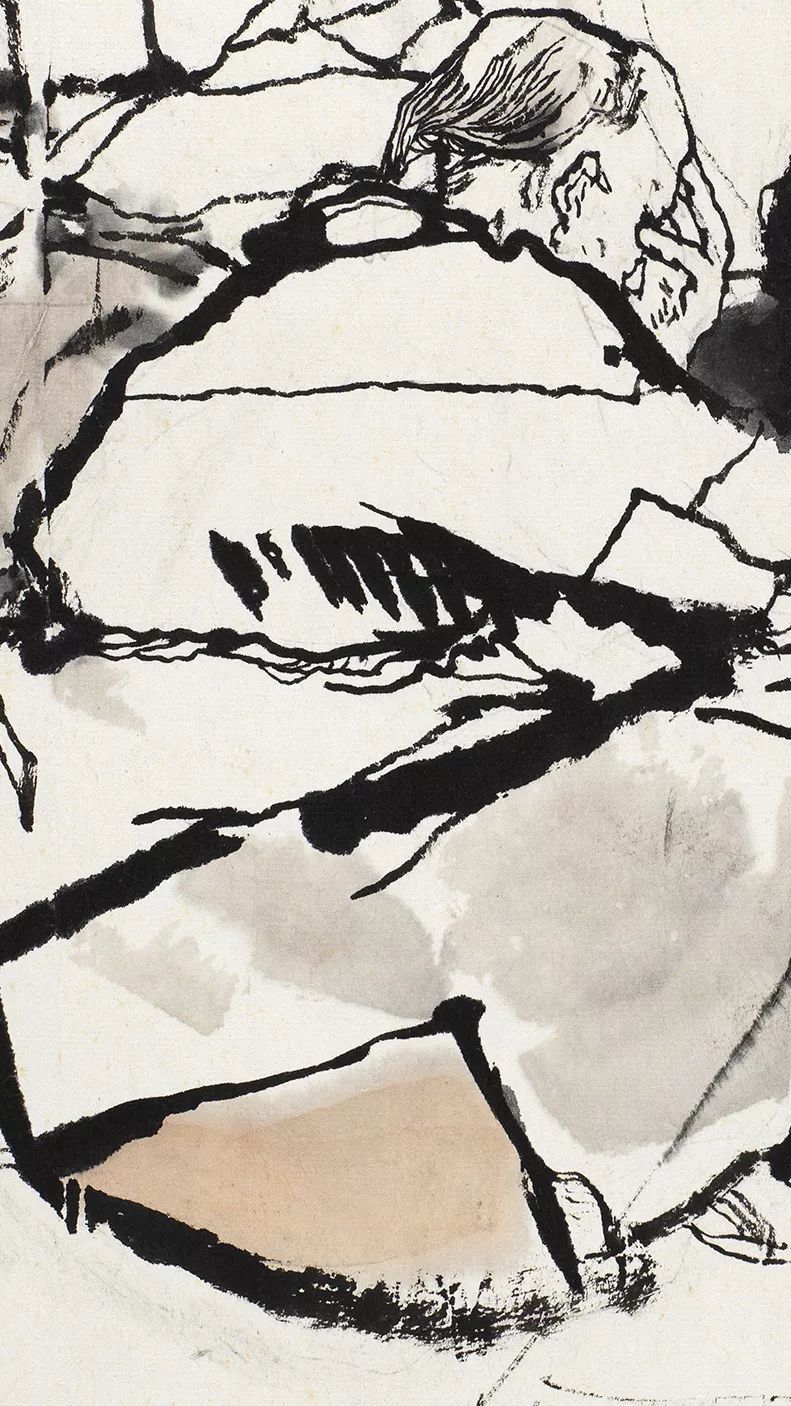 古人谓:“以笔取气,以墨取韵。”这张全景式的构图作品被画得满满当当,但因为笔墨多变富有层次,没有给人平淡无奇的感觉,反而是雄奇震撼,墨韵十足。一张书本大作品能表现繁复的水墨内容很难,对作者的功力要求极高。整个画面以块面为主要笔墨形式,表达明确且声色凝练,辅助的线条圆韧凝重且含蓄精炼,每一笔都沉着有力,却毫无粗野习气。程十发对笔的提按把握适当,通过画面可以感受到他行笔的速度与力度,其宛如“锥画沙,屋漏痕”般的线条内涵无限。