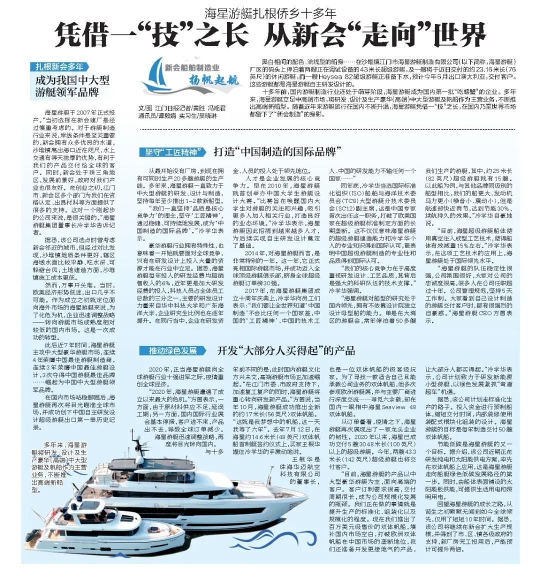 十多年前,国内游艇制造行业还处于萌芽阶段,海星游艇成为国内第一批“吃螃蟹”的企业。多年来,海星游艇立足中高端市场,将研发、设计及生产豪华(高端)中大型游艇及帆船作为主营业务,不断推出高端新船型。随着近年来游艇旅行在国内不断升温,海星游艇凭借一“技”之长,在国内乃至世界市场都留下了“新会制造”的身影。