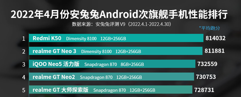 安兔兔4月安卓次旗舰手机性能榜:搭载天玑8100的红米K50、Realme GT Neo3霸榜前二(图源安兔兔)
