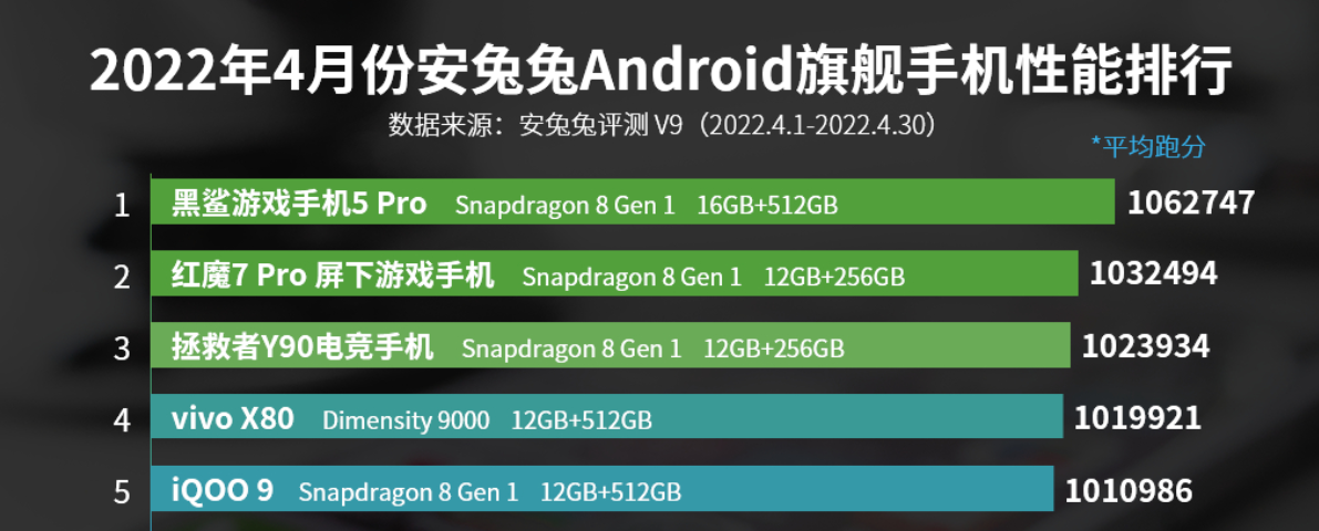 安兔兔4月安卓旗舰手机性能榜:搭载天玑9000的vivo X80杀入旗舰机性能前五(图源安兔兔)