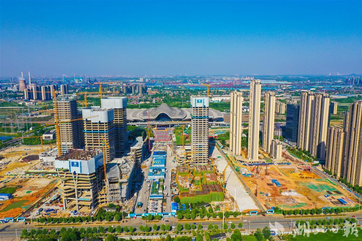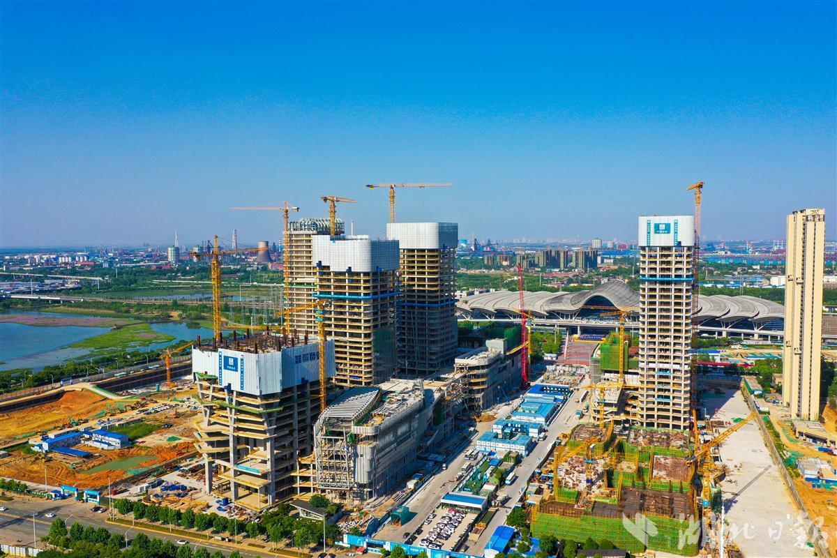 5月5日,正在加紧建设中的武汉杨春湖高铁商务区。该商务区包括前海人寿城市综合体、华侨城·欢乐天际综合体、金茂府城市综合体等项目,总建筑面积约233万平方米,预计2024年基本建成,届时将实现总部经济、金融服务、时尚消费、文化旅游等产业集聚发展。(湖北日报全媒记者田悦 摄)