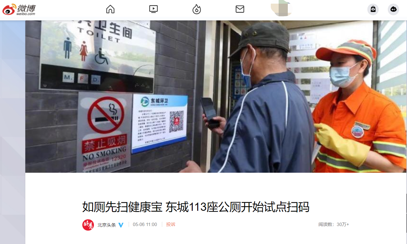 区环卫中心相关负责人介绍,公厕有其一定的特殊性,在流调的时候往往容易出现一个真空。为了弥补这个空白,东城区环卫中心在天坛和前门街道的 113 座公厕进行试点张贴健康宝二维码,通过这种方式引导居民扫码如厕。