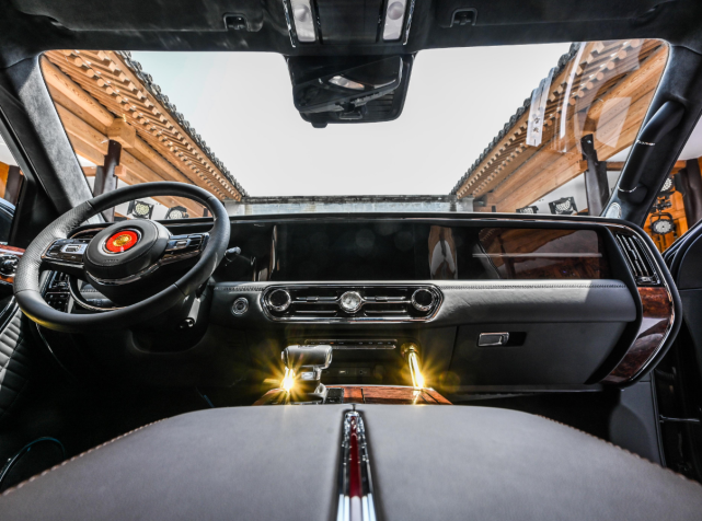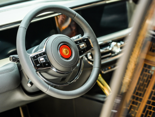 内饰方面,红旗LS7的内饰布局融入古典风格与智能科技,整个中控台的布局规整大气,融入实木、皮革、金属等不同材质互相搭配,有助于提升内饰的设计感。其中方向盘采用双辐式设计,中央为金葵花标识,而方向盘下方的半圆形镀铬装饰可用于控制喇叭。