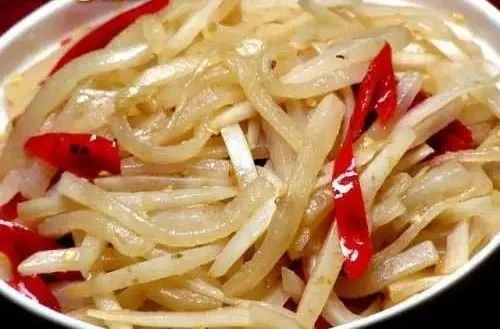 母亲做得最多的是清炒萝卜条。那时候没有反季节蔬菜,普通老百姓家全年下来基本就是“萝卜土豆白菜”。母亲先把青萝卜切成细条,用清水浸泡,去除萝卜的辛辣味。再拿一丁点五花肉切成末,干红辣椒切成丝。热锅放花生油,葱姜末爆锅,辣椒丝和肉末放入,加酱油炒熟,然后放入萝卜条,迅速翻炒后加入醋和盐,再翻炒后出锅。这道清炒萝卜条,因为比较早地放了醋,吃在口中,萝卜非常清脆,微微发酸,香中带辣,比别人家的水煮萝卜片儿不知好吃多少倍。母亲还会同时烙上一筐单饼,一张单饼卷上一筷子萝卜条,外软里脆,两只手攥着大口吃,简直是美极了!用同样工艺,母亲还经常做醋溜土豆丝、清炒白菜芯等菜,放上点泡发好的地瓜粉条和香菜梗,就更好吃了。