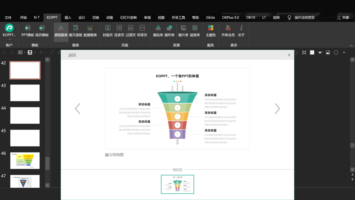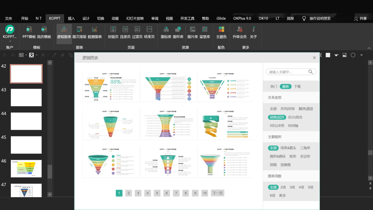 可以点击最新或输入【漏斗】,选择合适的逻辑图即可插入PPT中,修改内容即可。
