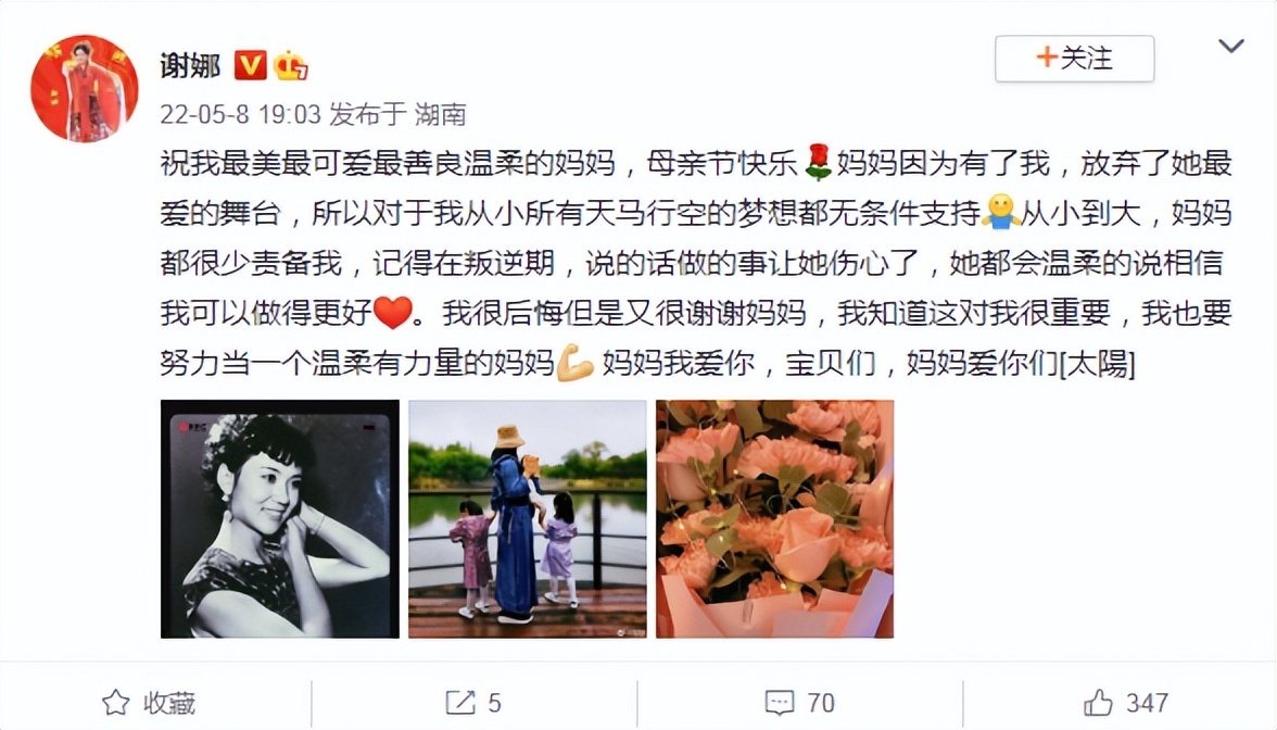 5月8日是母亲节,谢娜在个人社交平台晒出妈妈年轻时候的旧照,以及老公视角下与三个女儿的温馨合影庆祝。除此以外,娜姐还发文感谢妈妈,她直言妈妈年轻时候为了自己放弃了最爱的舞台,对于自己从小所有天马行空的梦想都无条件支持,从文字都能感受到娜姐对妈妈的爱意。娜姐还表示妈妈很少责备自己,哪怕在叛逆期,说的话做的事让妈妈伤心,妈妈仍然只是温柔地说相信自己。因为这些点点滴滴,娜姐直言很后悔,但也很感谢妈妈。文末,娜姐也表示会像妈妈一样当一个温柔有力量的妈妈:“妈妈我爱你,宝贝们,妈妈爱你们”,一席话令人感动不已。