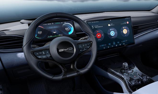 海豹内饰同样采用 “海洋美学”设计理念,采用了灰蓝+黑的撞色设计,设计以海洋为主线,仪表台上部的起伏形态如同涌起的海浪,铝金属色的装饰条烘托了海豹的运动感与年轻属性。液晶数字式仪表和自适应旋转悬浮Pad则是比亚迪的标志性设计。作为仪表台的视觉核心,平直延展的装饰线条拉伸了车内的横向视觉宽度。