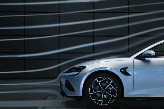 根据测算,纯电动车的风阻系数Cd.值每降低0.01,续驶里程可以增加8km。在比亚迪海豹上,基于海洋美学的设计理念,并得益于基于e平台3.0的电池车身一体化结构(CTB),可以将车身高度降得更低,从而获得更为低趴的整车姿态。此外,海豹采用了八合一电动力总成,加之海豹采用的后驱/四驱动力架构,海豹的前机舱高度可以尽可能压低,前机舱盖的流线型曲面设计降低了风阻。