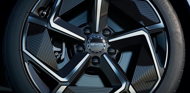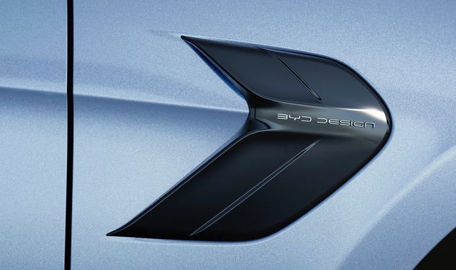 前轮眉后方的黑色装饰,其与后仰式的腰线连成一体,也勾画出运动轿跑车的优雅神态,上面还带有“BYD DESIGN”的英文字样。