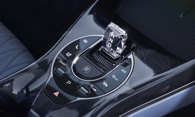 海豹中控下方区域采用隆起式设计,两侧曲线勾勒出“小蛮腰”状的中控轮廓。透明换挡杆造型小巧,如同晶莹剔透的水晶,精致感拉满。周围的按键则采用环抱式的布局,也高度契合了内饰流畅、优雅的设计理念。