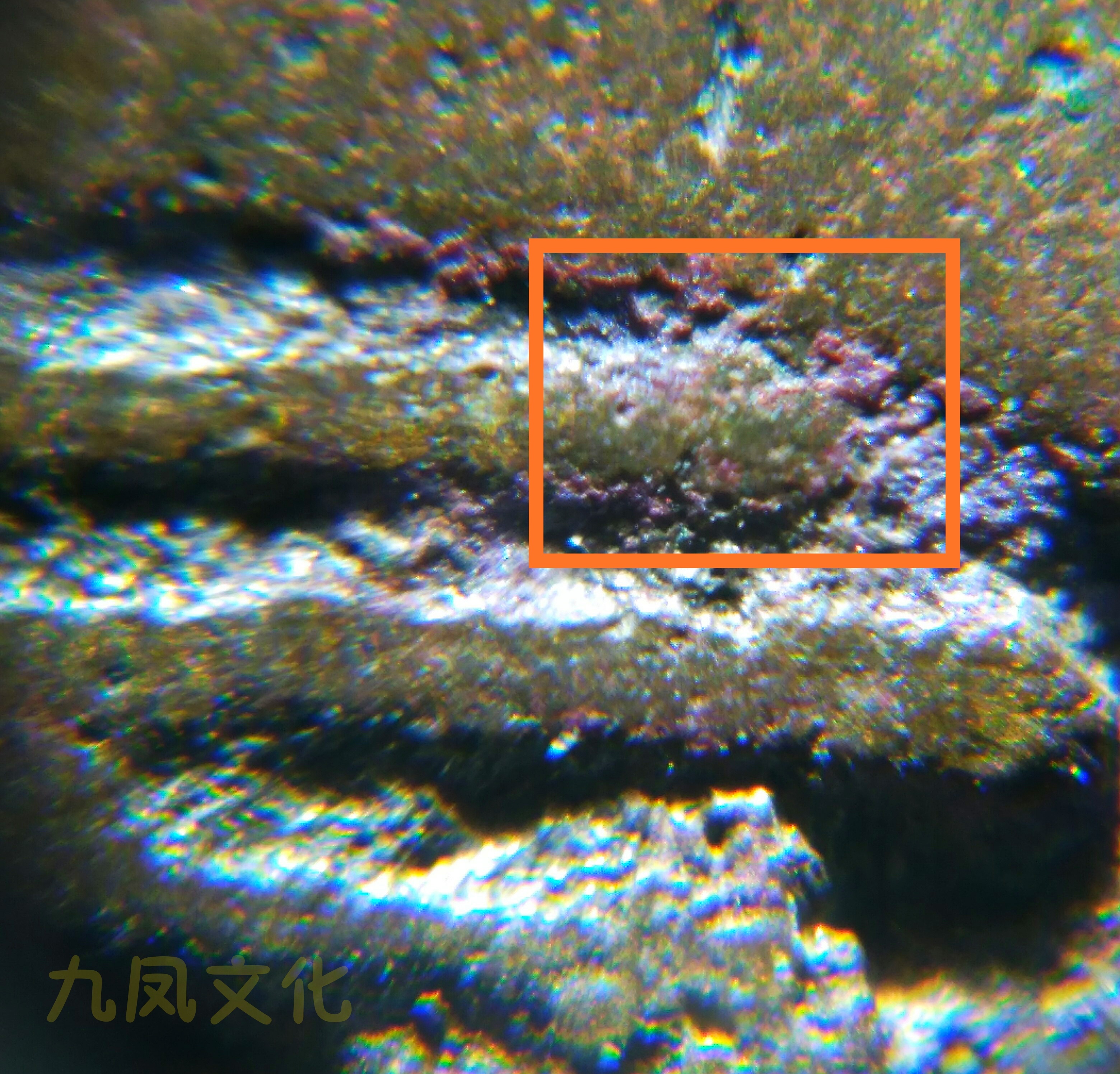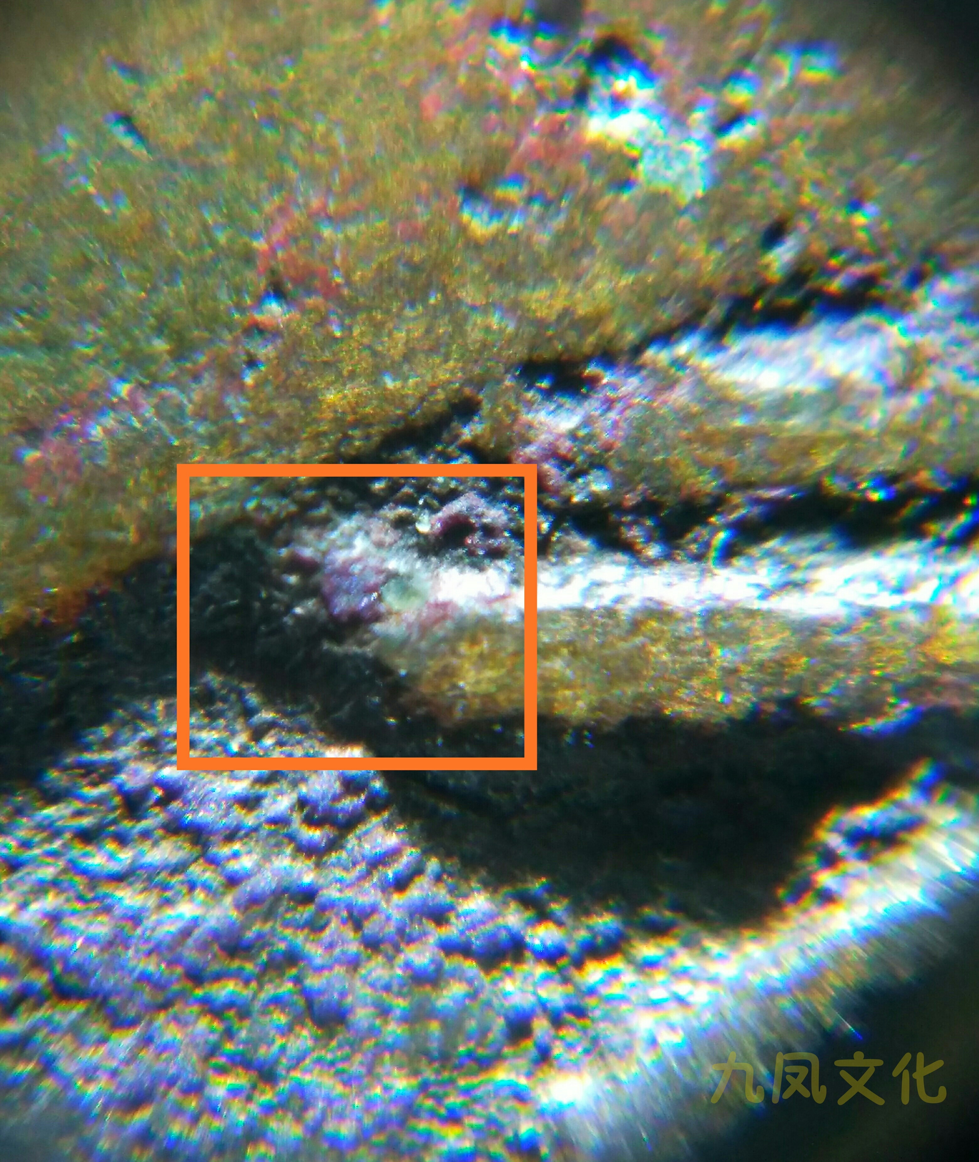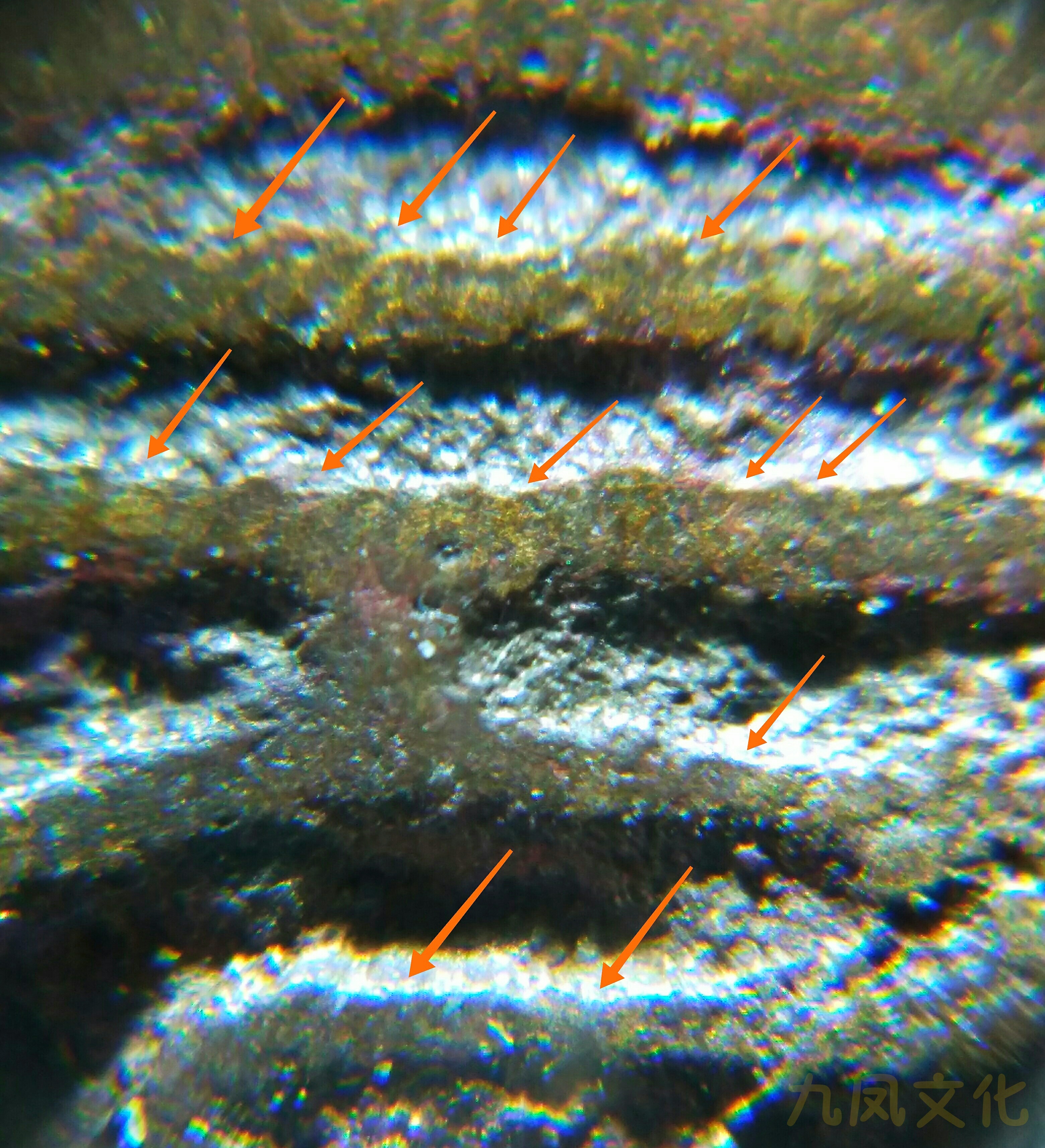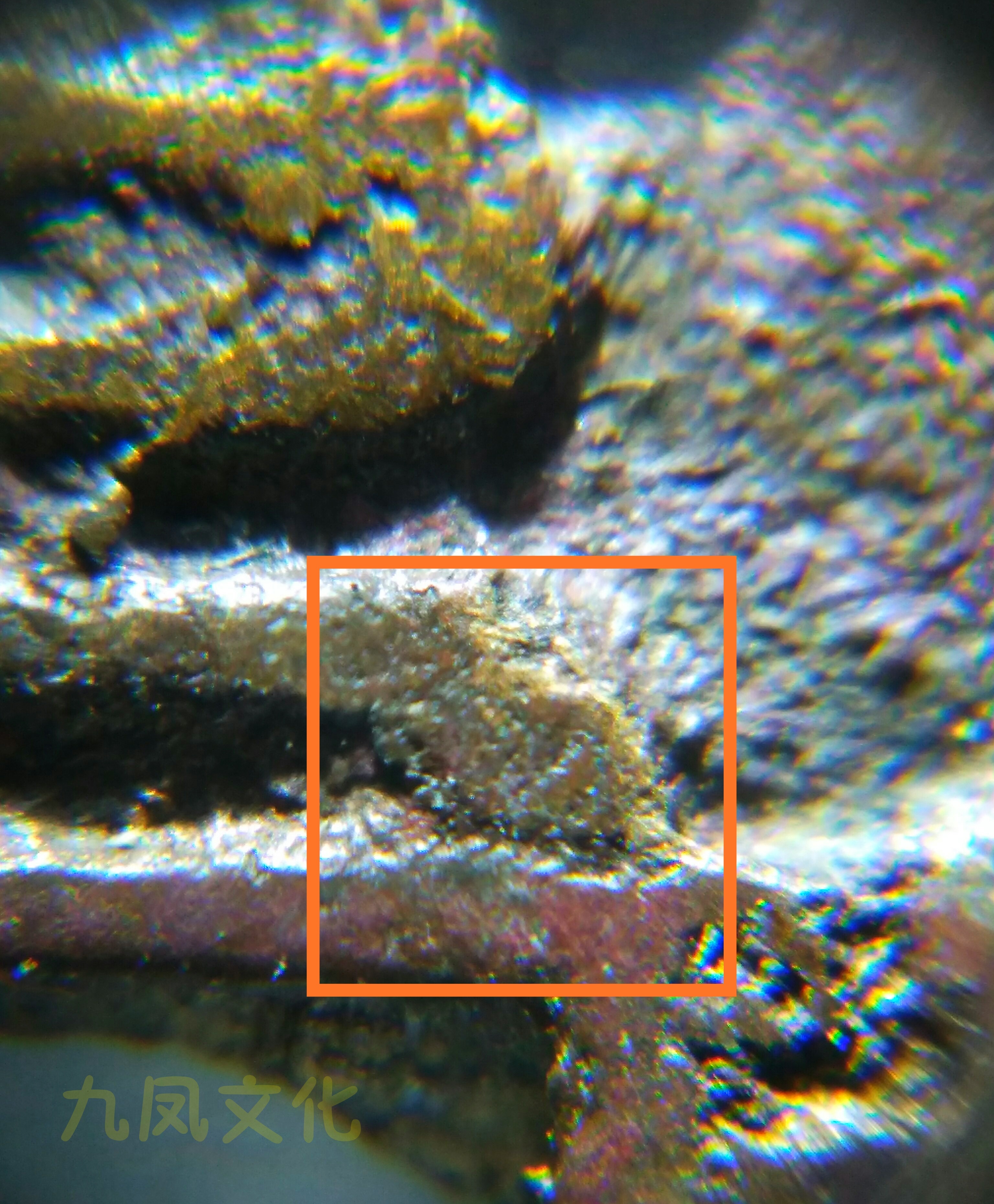 在图2币中还可以看到,图2币是一枚鎏金币,这在它的微观图中已展示的非常清楚,其钱表深红色的暗斑也印证了这一点,那是钱币在鎏金过程中残留的氧化汞的颜色。