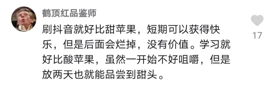 “刷抖音就好比甜苹果,短期可以获得快乐,但没有价值。学习就好比酸苹果,虽然一开始不好咀嚼,但放两天也就能尝到甜头。”