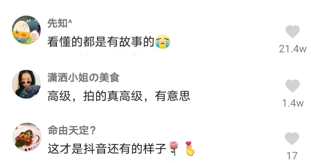 “看懂的都是有故事的”“高级,拍的真高级,有意思”“句句不提爱情却句句不离爱情,对生活闭口不谈却人生满怀”……评论里,满是对他内容的称赞。