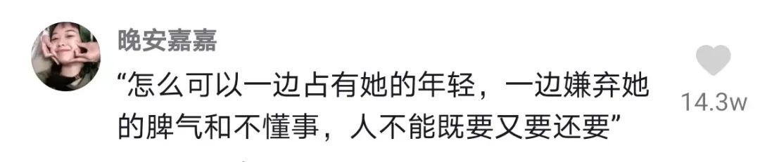“怎么可以一边占有她的年轻,一边嫌弃她的脾气和不懂事,人不能既要又要还要。”