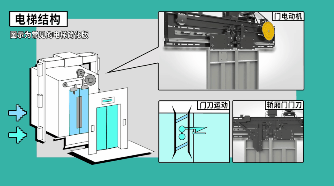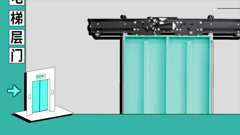电梯门其实分为两层,一层是等电梯时所看到的层门,一层是会随电梯一起运行的轿厢门。电梯运行时,轿厢门由电机驱动,层门本身没有动力。当电梯到达楼层,由轿厢门的门刀卡住层门,从而带动层门开关。