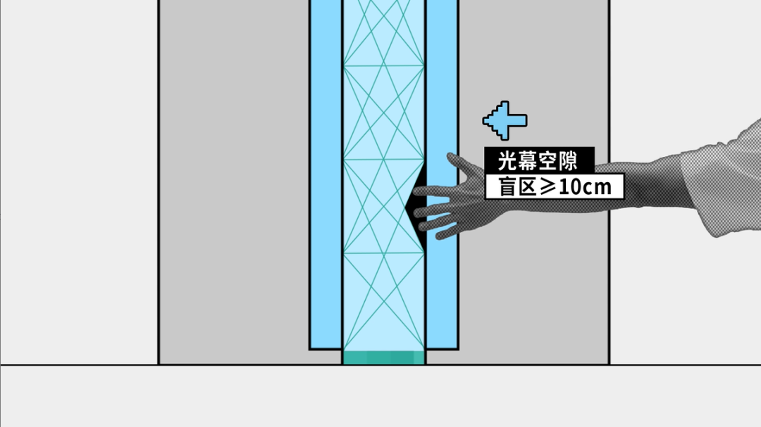 国标规定,电梯门扇闭合过程中,允许最后2厘米内保护装置的暂时失效。但对于光幕电梯来说,在关门的最后时刻,红外光束之间的缝隙变大,盲区可能达到十厘米以上。
