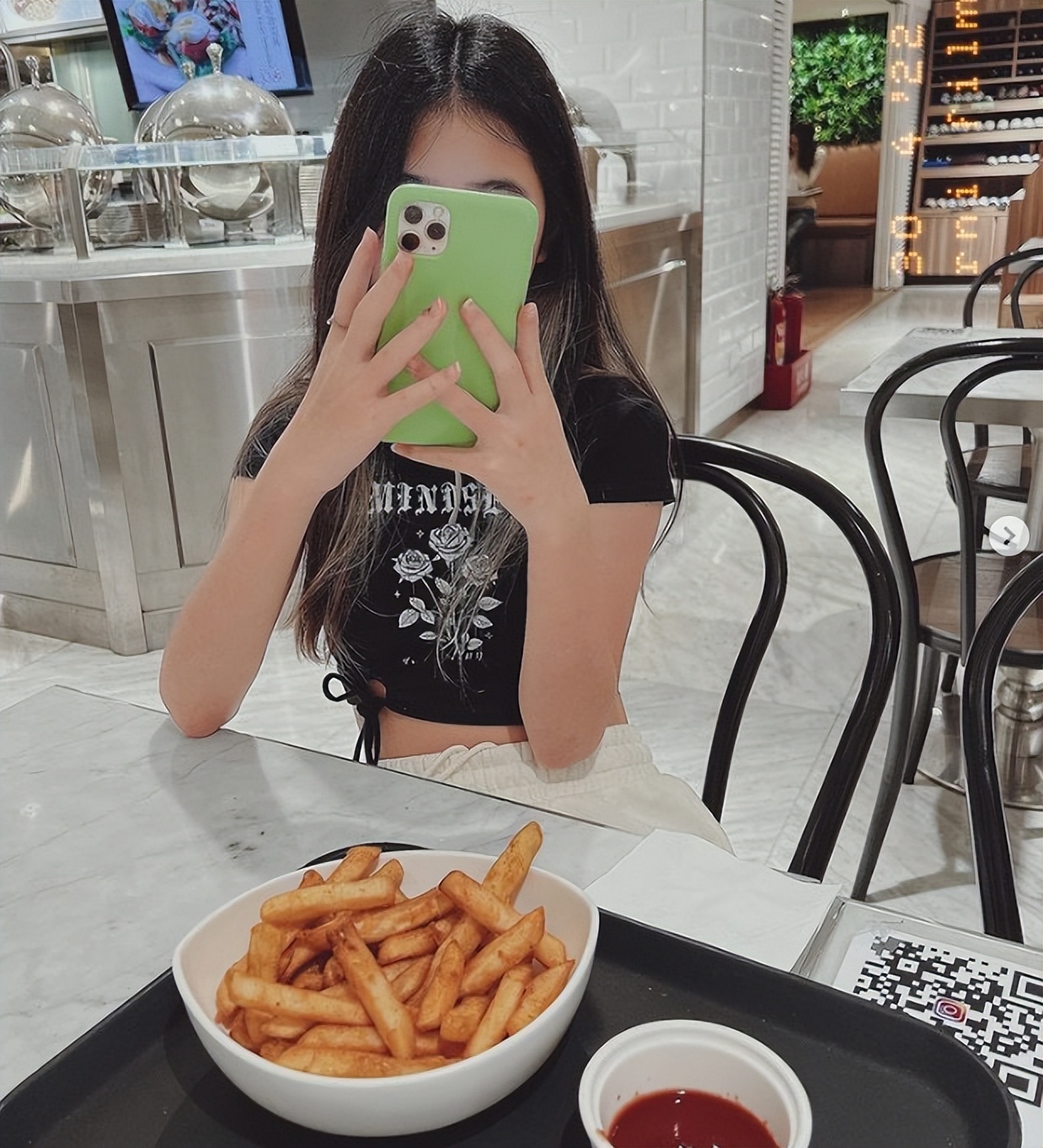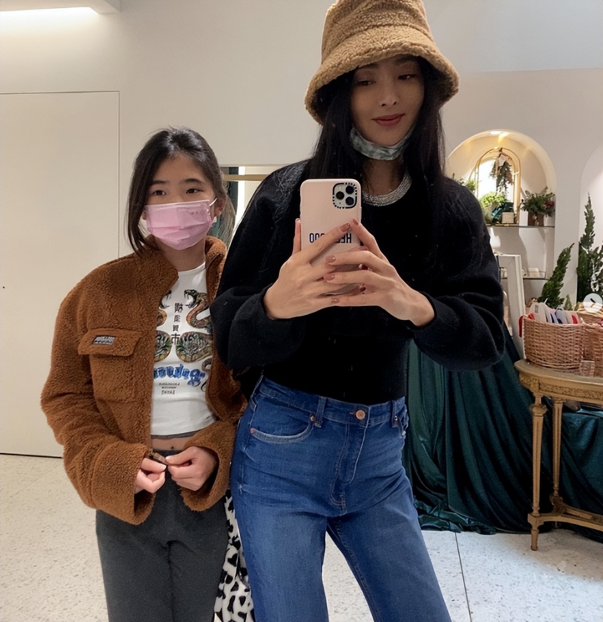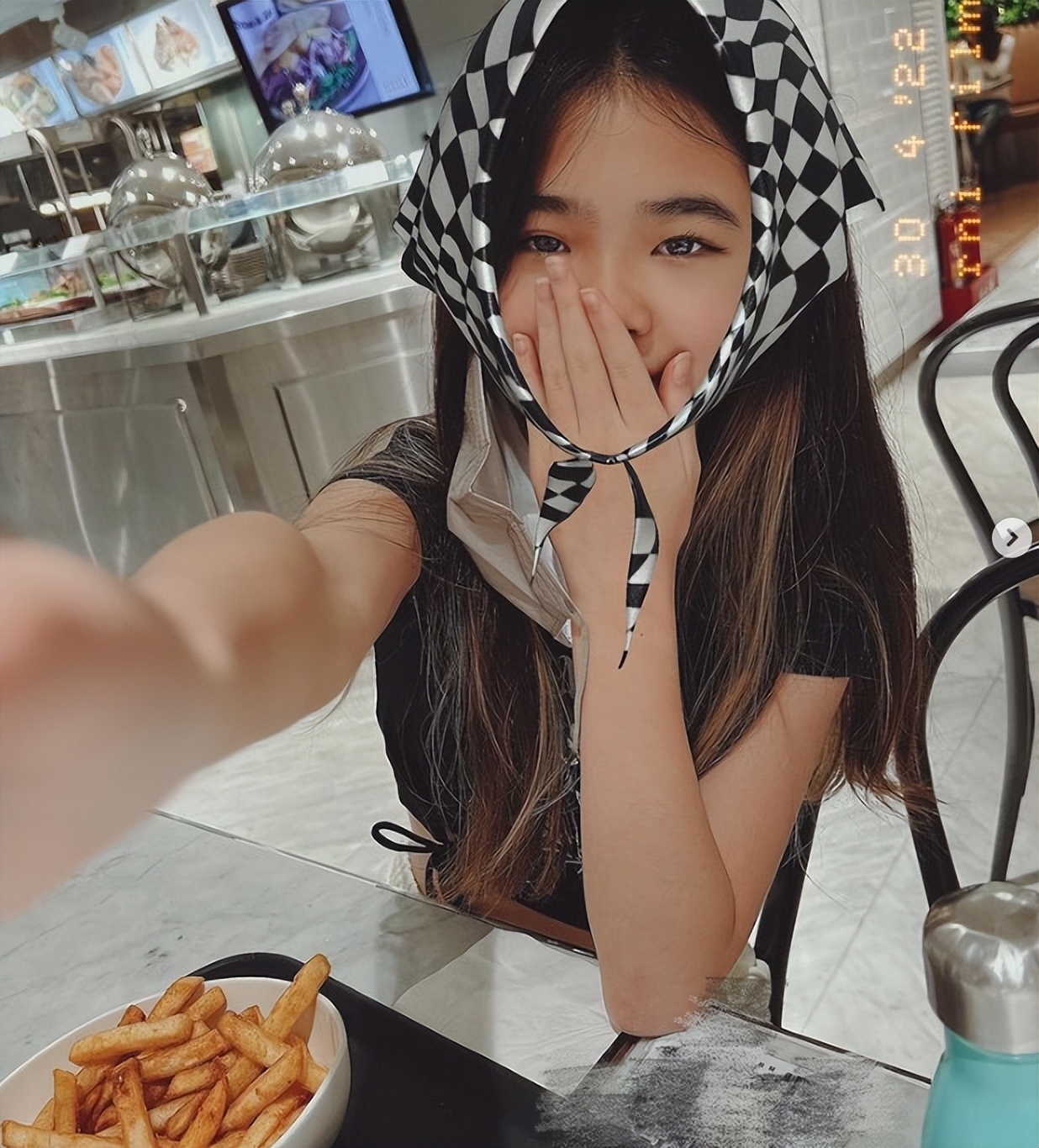 另一个角度里,Grace正在玩手机,不知道是不是在和对面的妈妈玩互拍,她食指佩戴的戒指很惹眼。她的脸蛋儿被手机完全遮住,一头挑染长发和露脐上衣的搭配炫酷十足。真是没想到曾经“丑萌”的姐姐一下子就长这么大了,而且还愈发爱美、愈发时尚,小小年纪就已经染发,真是深受妈妈时尚感熏陶啊。