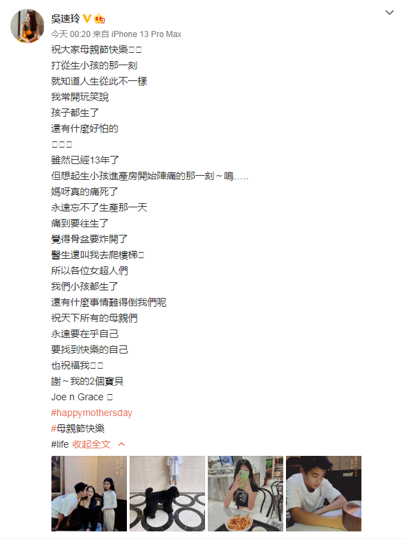 与此同时,吴速玲也在自己的社交账号上发文庆祝母亲节,她还感慨当初生小孩痛到要往生,甚至觉得骨盆要炸开了。然而看到现在两小只如此暖心,内心也是满满的欣慰和感动。