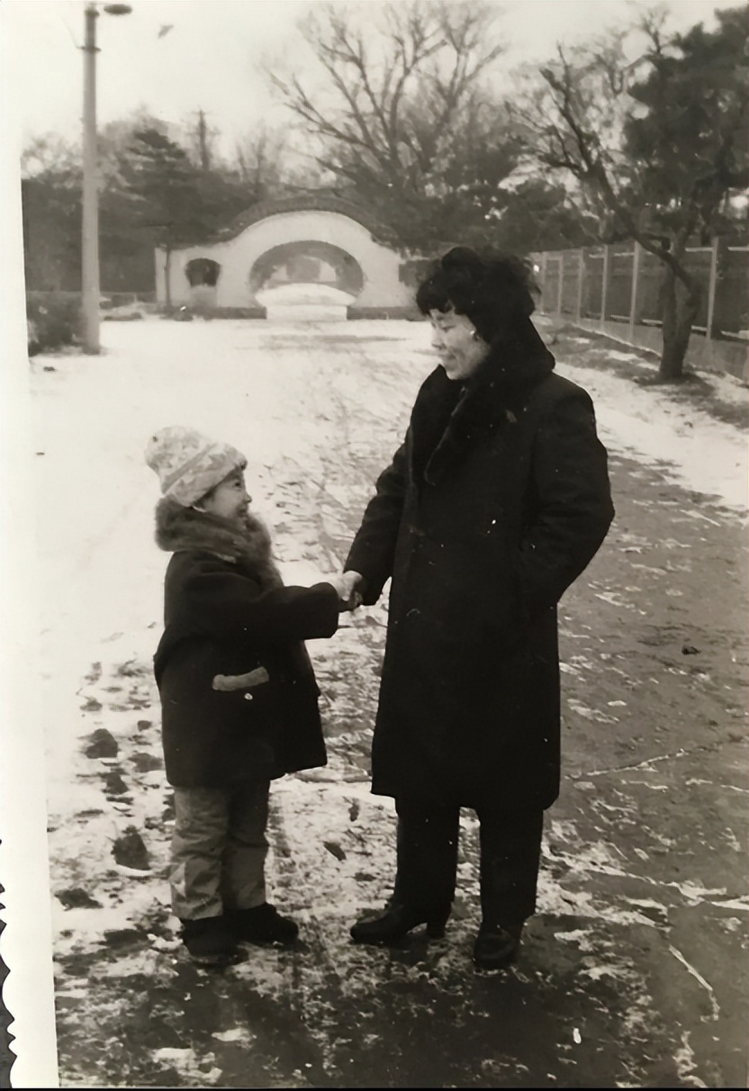一个奶奶和一个小孙子在雪地里深情对望。从他们的穿着来看,家庭条件应该很不错。