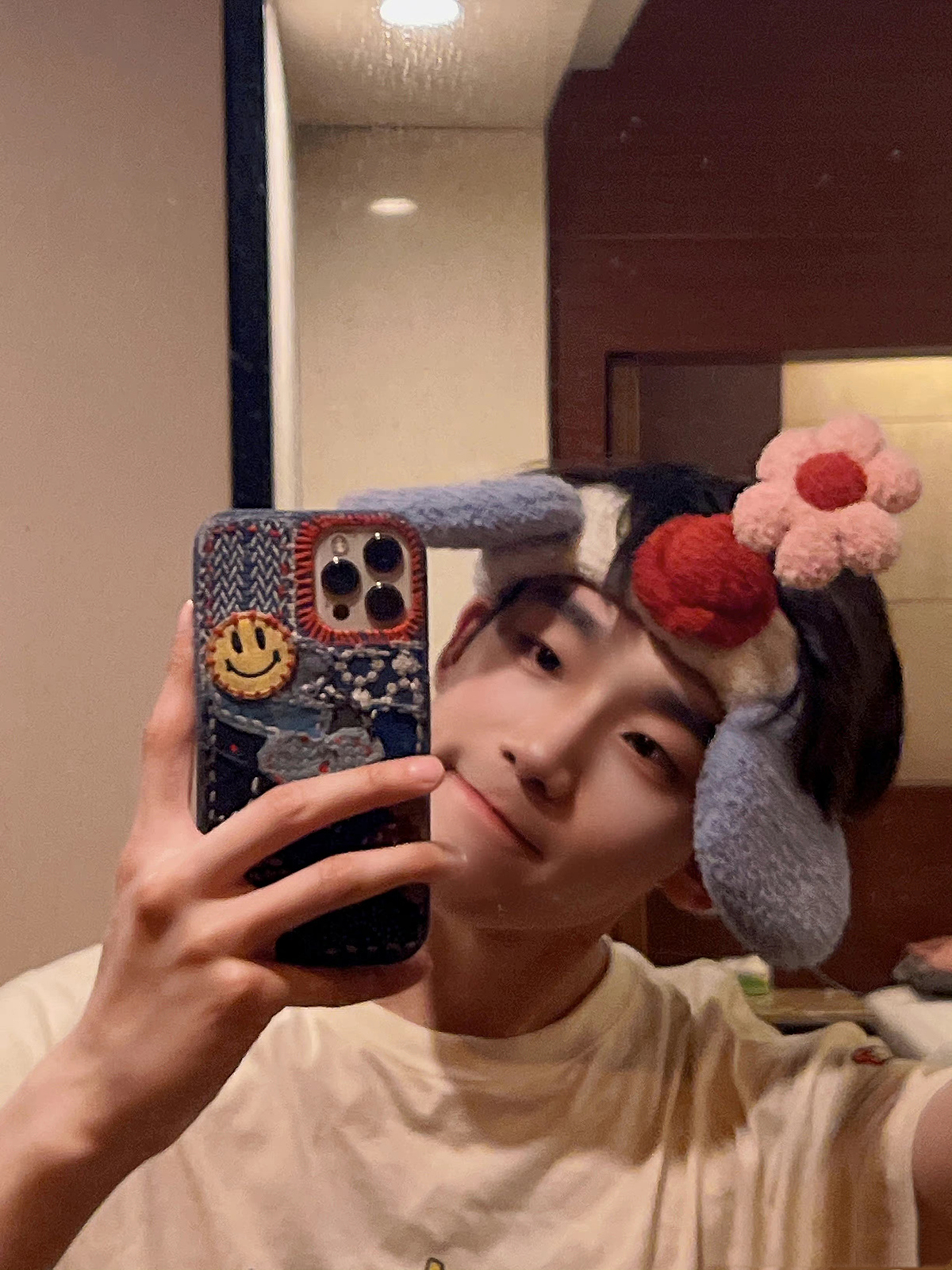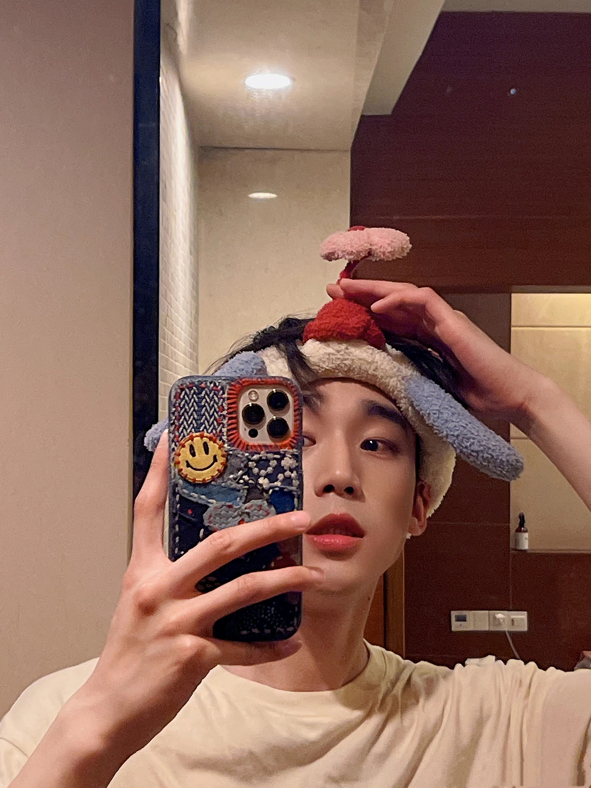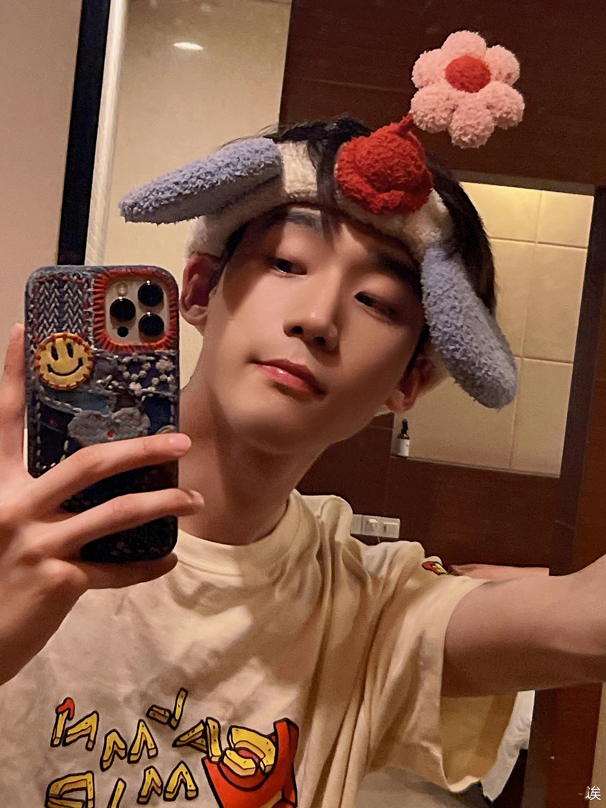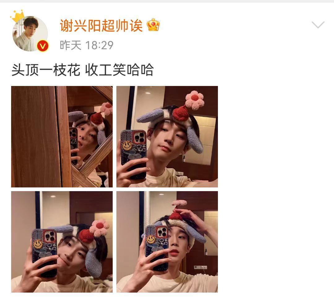 8日,演员谢兴阳在社交平台分享出收工后的对镜自拍照,并配文:“头顶一枝花 收工笑哈哈”。照片中,谢兴阳身穿米色短T,头戴粉红色卡通小花束发带,帅气搞怪连拍,尽显当代年轻人结束一天辛苦工作之后的活泼可爱之态。